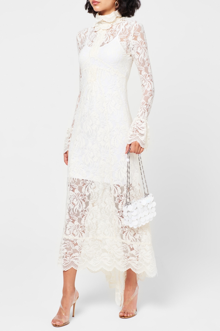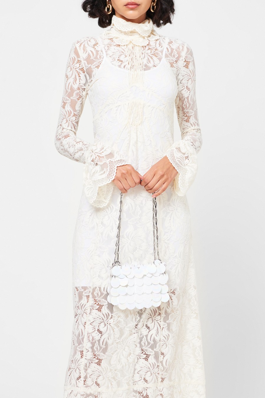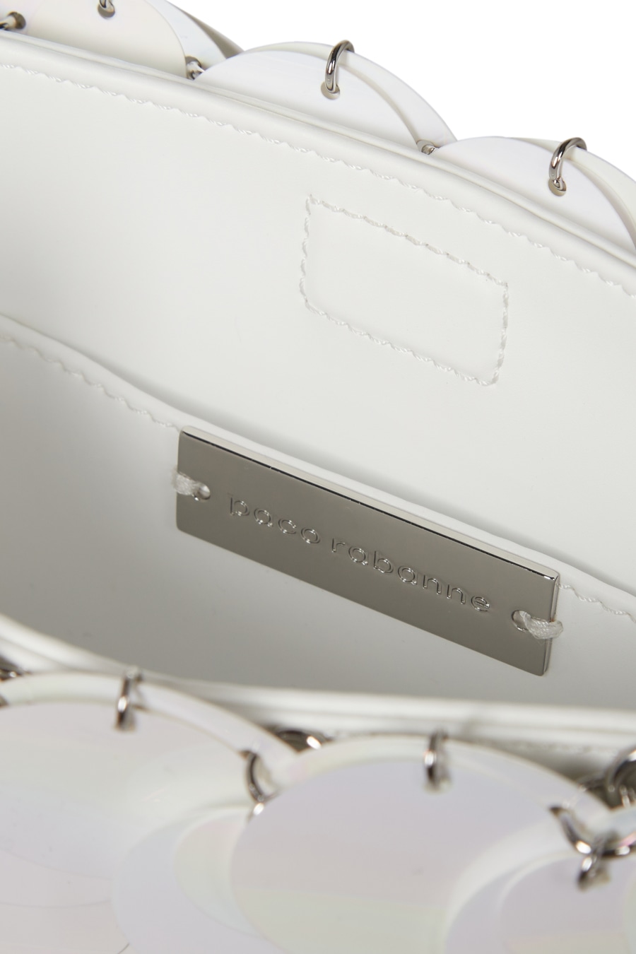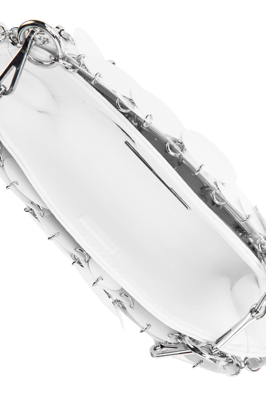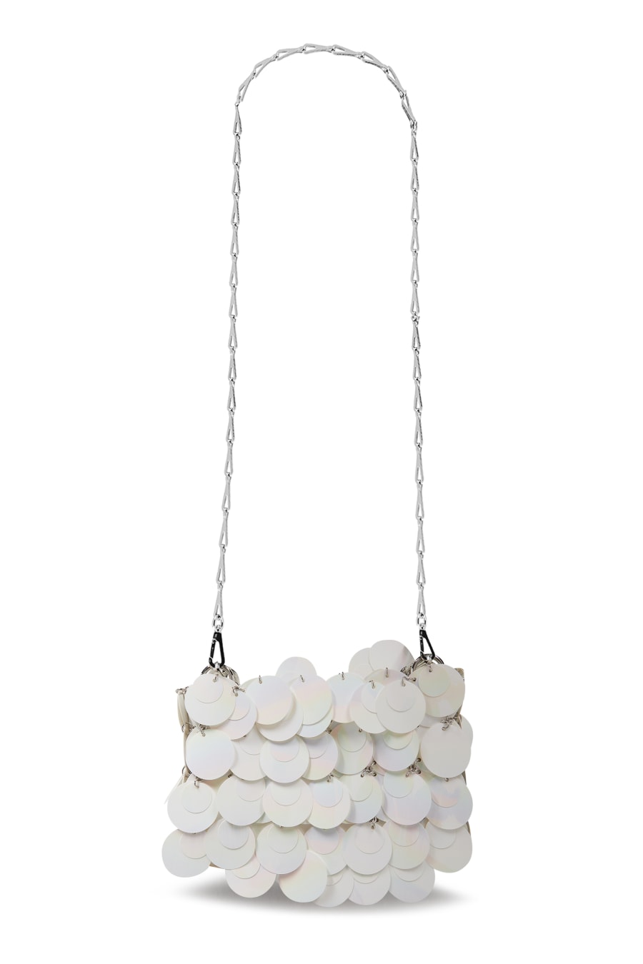 Add a statement accessory to your collection with the paco Rabanne 1969 Sparkle Nano Bag. In a petite silhouette, this staple bag details silver plastic lozenges with a mirrored effect to the exterior adorned with silver-toned hardware for a premium touch. With a main compartment secured with a magnetic fastening and features one small slip pocket for your essential items, this piece adorns an adjustable chain strap which can be doubled up to create a shoulder strap or worn as a single chain for a crossbody style. Made from 75% Plastic and 25% Brass. H 11cm x W 17cm x D 3cm.