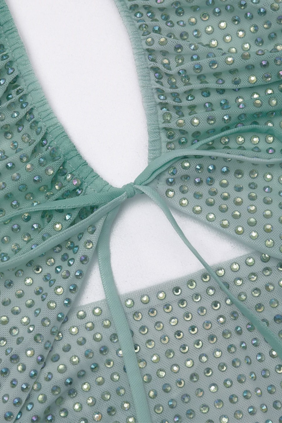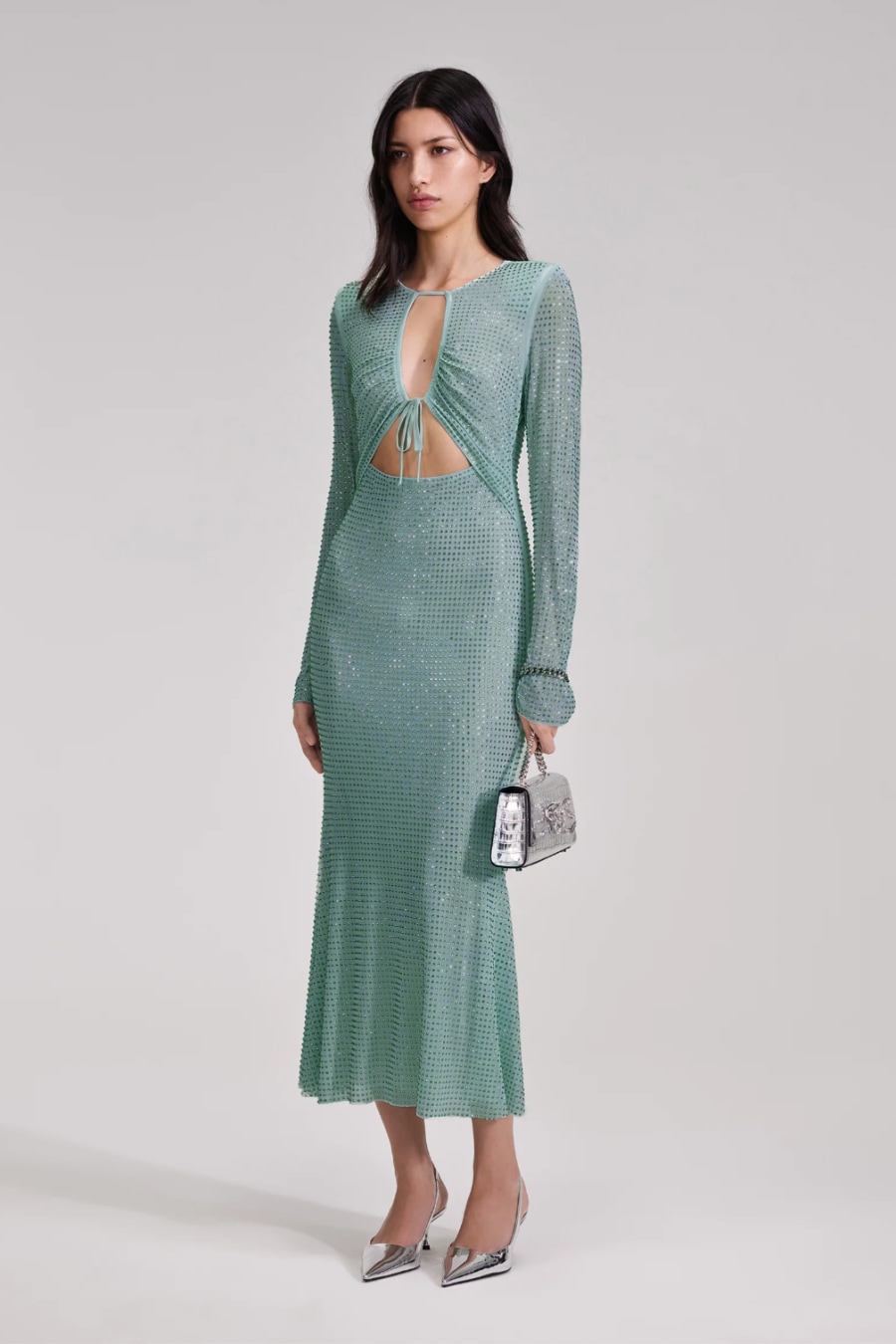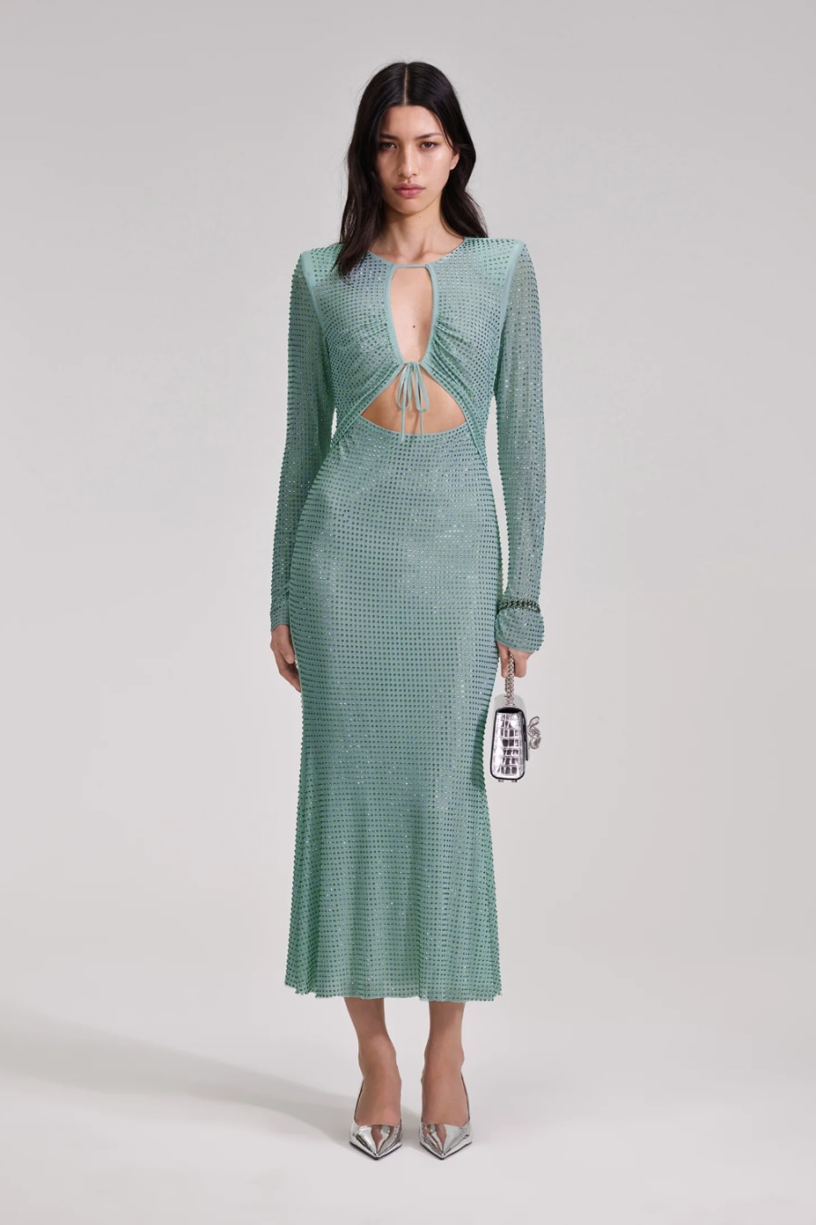 A guaranteed scene-stealer in shimmering crystal-studded mesh, this calf-skimming dress is designed with a keyhole detail to the neckline and long sleeves for extra shimmer. Its flattering tied scoop neckline draws attention to your curves, whilst the flowing skirt is made for whirling around the dancefloor. Pair with statement heels and a sleek updo for your next soirée. Check the Size Guide to find your perfect fit.