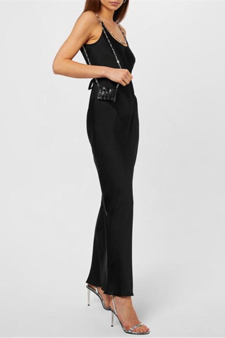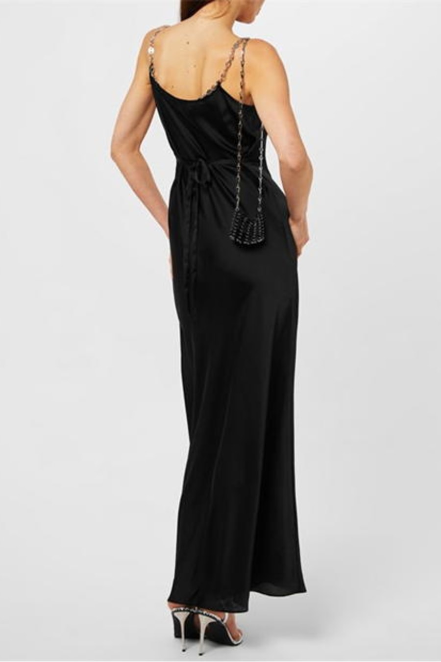 Enhanced by a chain-link trim at the neckline, this Paco Rabanne dress boasts a self-tie belt at the waist and a dramatic floor-sweeping hem for an eye-catching look.