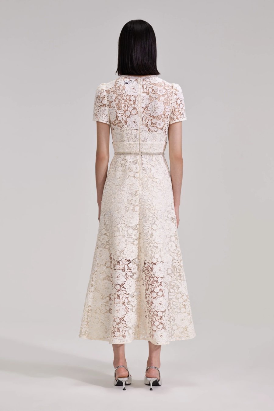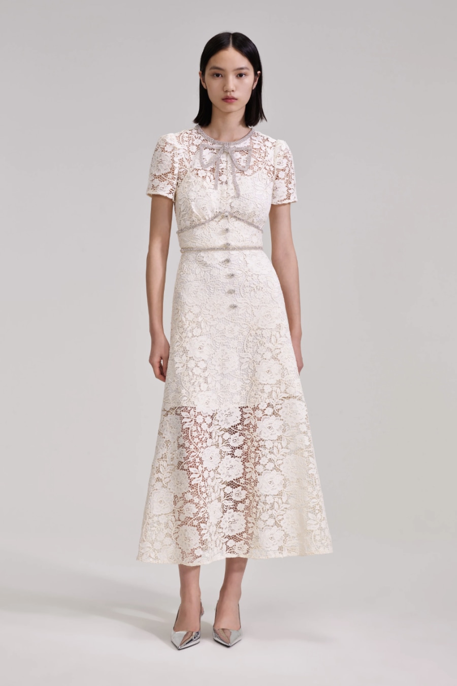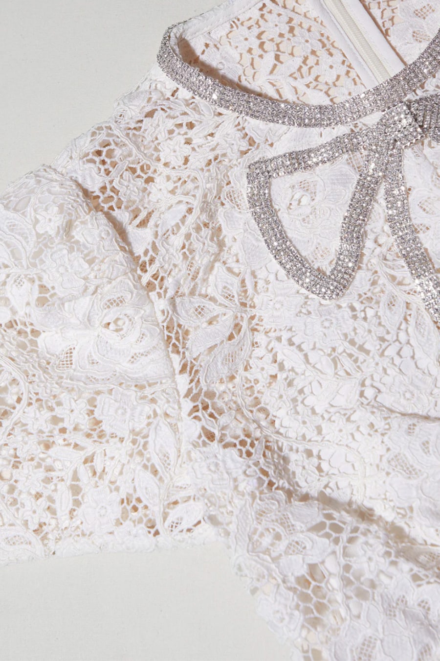 Dazzle in this delicate cream dress cut from corded lace decorated with a bow at the neck. Diamanté details add sparkle, as the glittering buttons and belt to define your waist. The sheer lace skirt keeps the look sensual yet sophisticated. Pair with a sleek updo and statement accessories for your next soirée. Check the Size Guide to find your perfect fit.