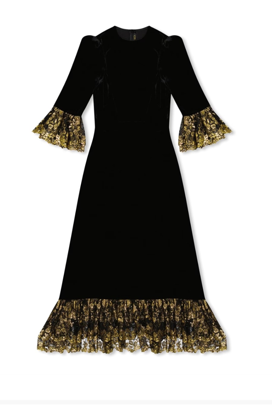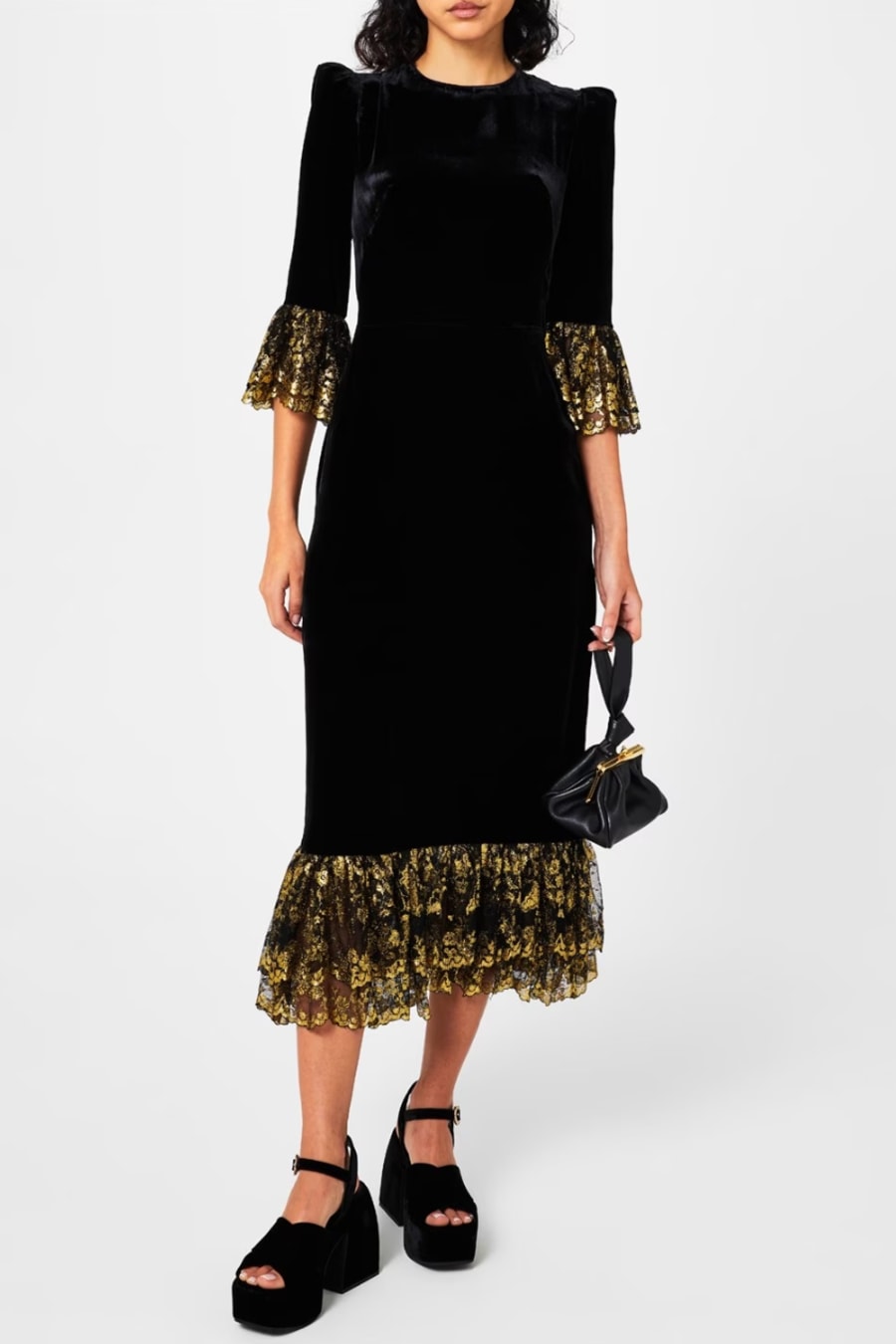 The Dark Dove Dress by The Vampires Wife will be a statement piece in your wardrobe. Crafted from a soft silk velvet fabrication, this piece falls elegantly to the ankle while being carefully shaped to define and flatter the figure. Designed in a solid colour way, this piece features a round neckline, elbow-length sleeves, and adorned with a tiered gold lace ruffle finish which elevates this classic silhouette. 82% viscose and 18% silk. Dry clean only.