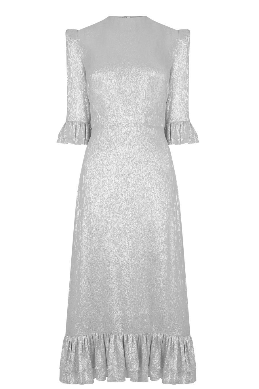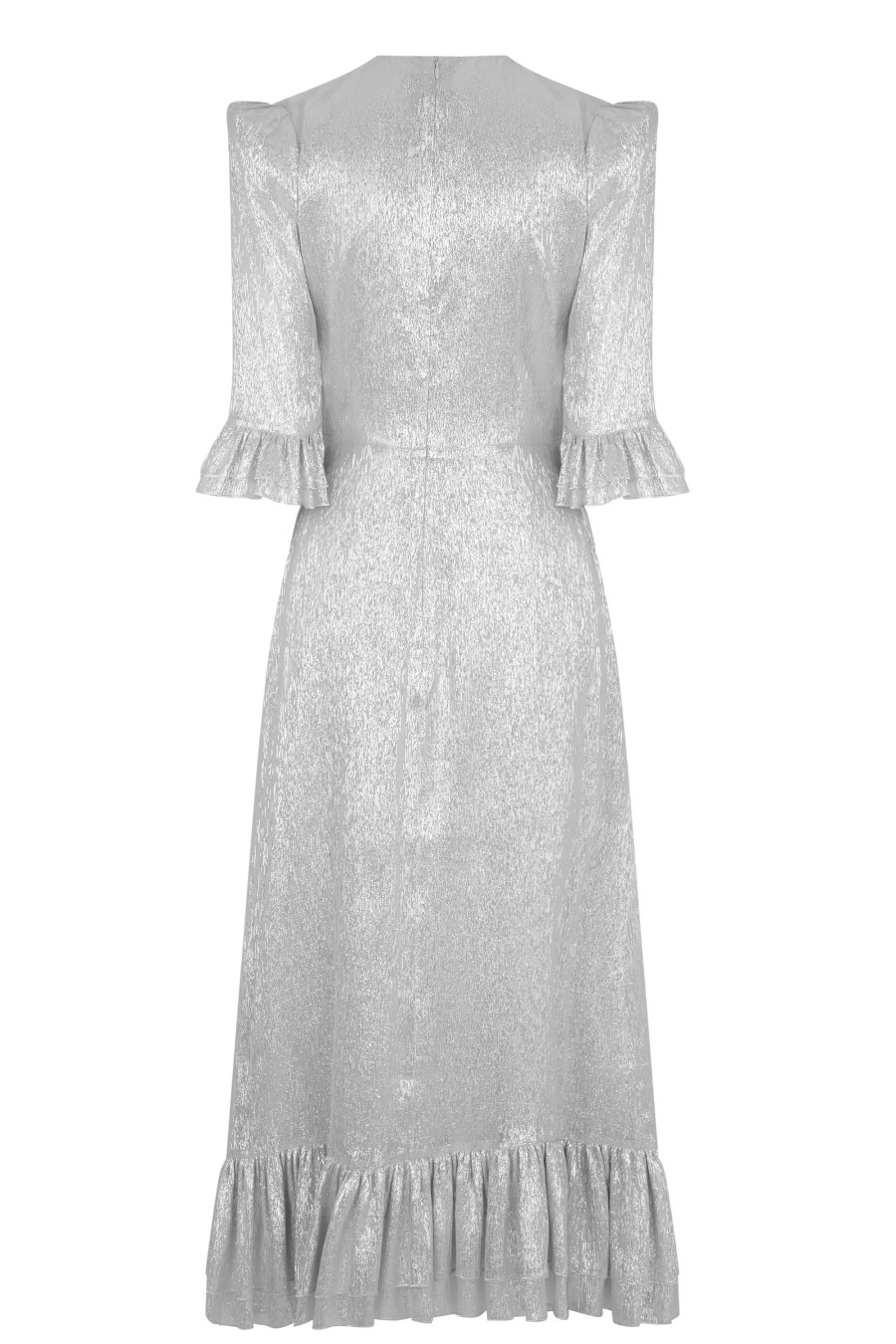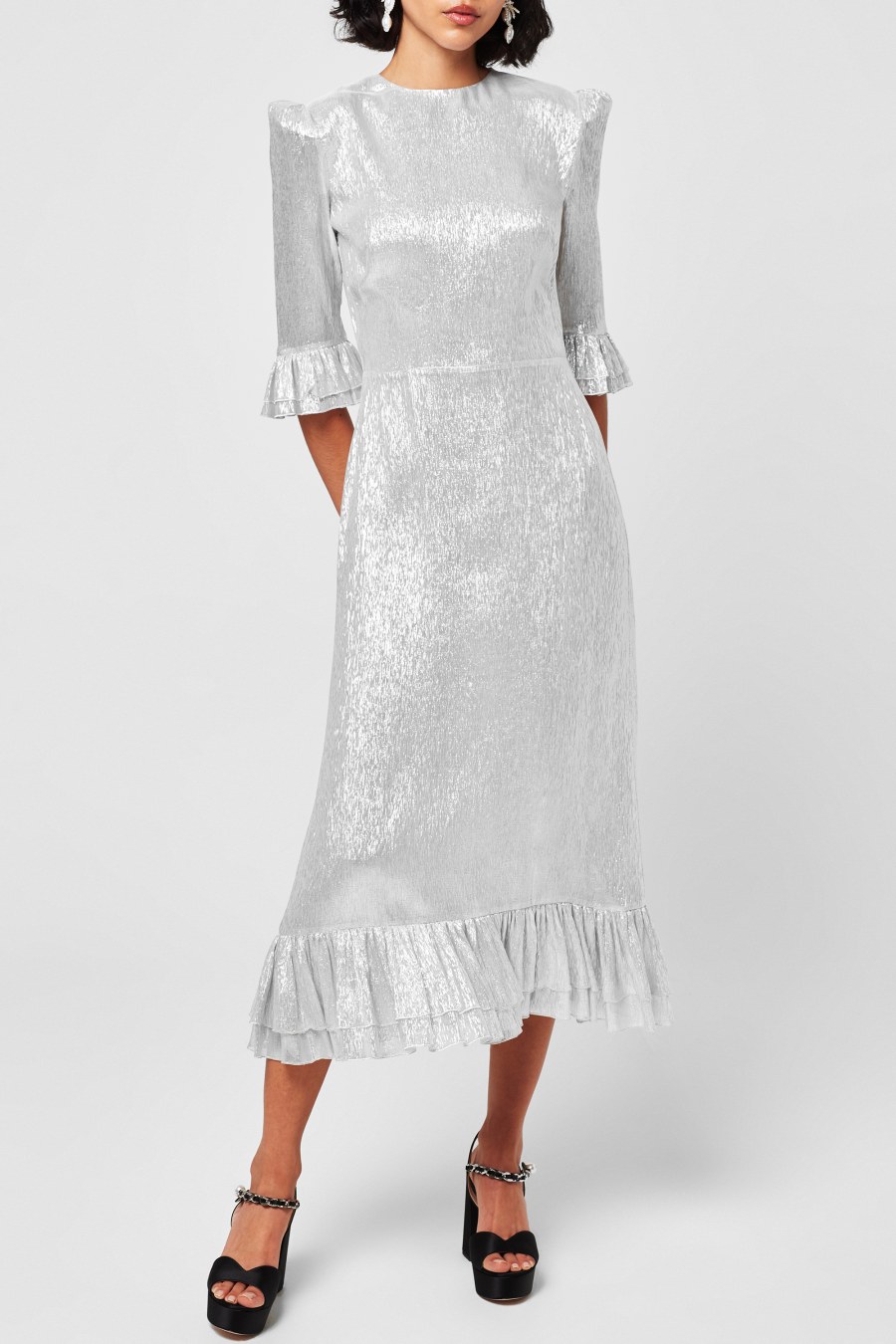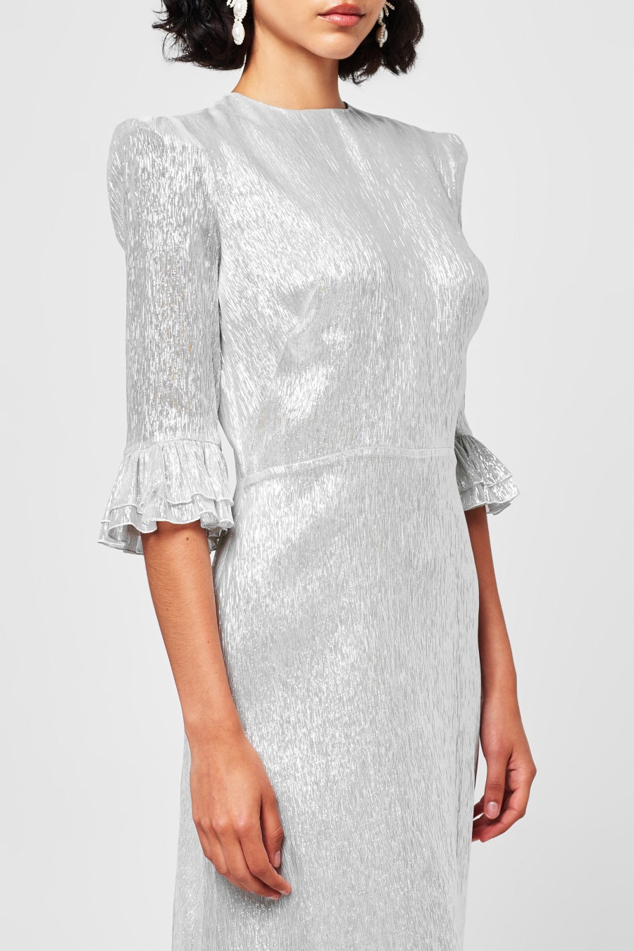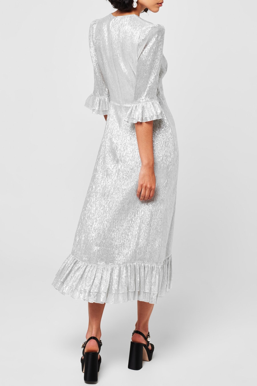 Make a sparkling statement in the Falconetti Dress from the Vampire's Wife. Combining gothic silhouettes with feminine touches, this dress is designed with a round neckline framed by defined shoulders and a ruffled cuff to the three quarter sleeves. Made from a glittering silver silk blend chiffon, this dress is finished with a ruffled trim to the hem to add a final flirty element.