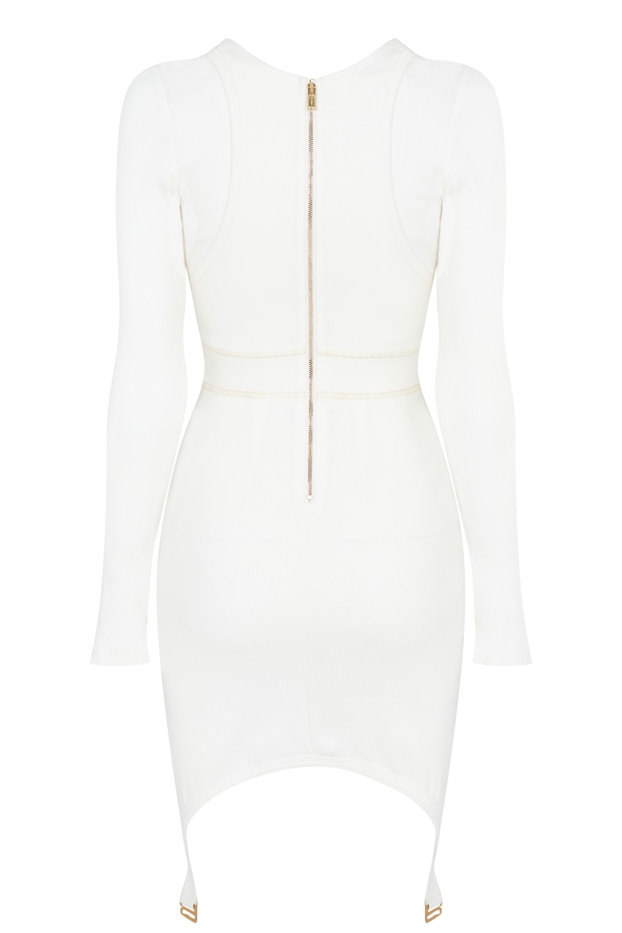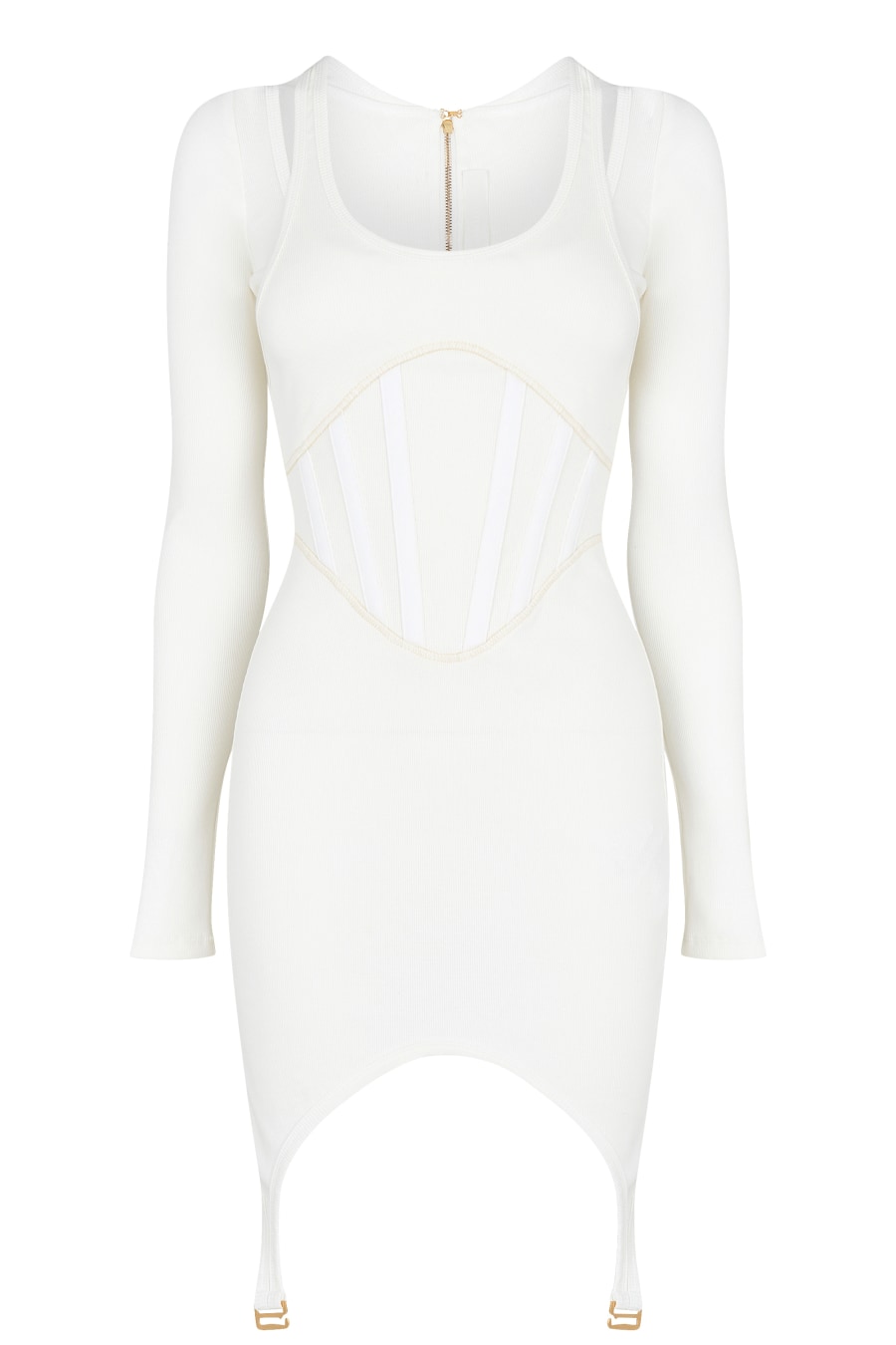 Add a sultry style to your collection with the Fin Corset Dress from dion Lee. Designed with a scooping neckline and long sleeves, this dress is characterised by a tank top layer to the bust to create a chic and modern silhouette. Cut to a mini length with a garter tabs at the hem, this dress is made from a stretch blend organic cotton in a ribbed construction. With a zipped closure to the rear and gold toned hardware for a premium look, this dress is finished with a boned corset to the middle to flatter and define your figure.
