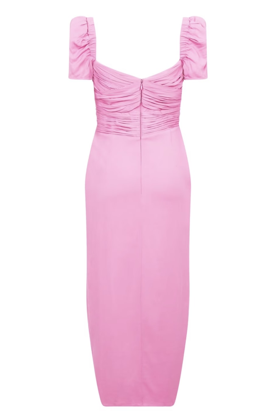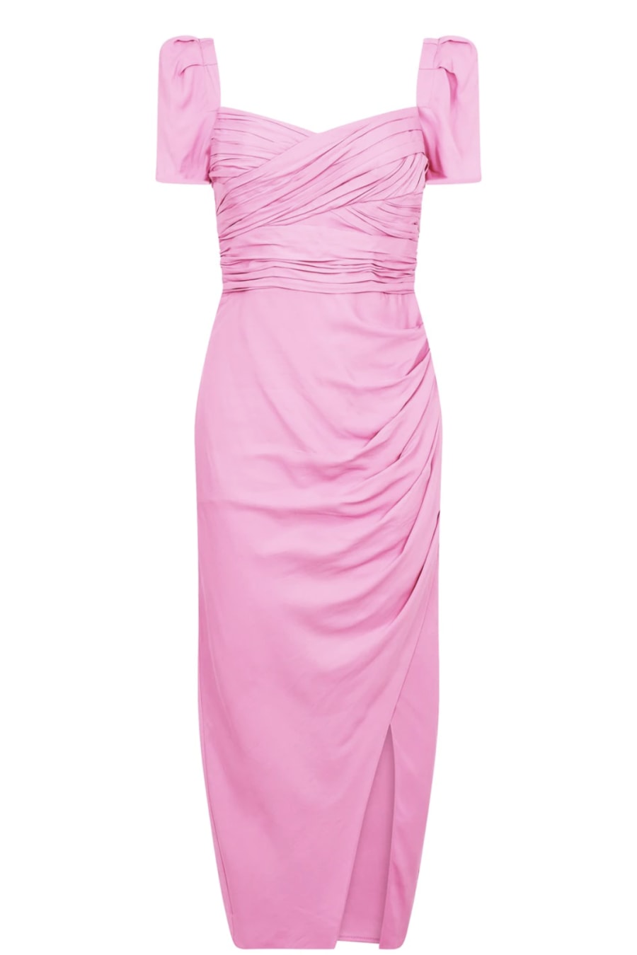 Add a vibrant shade to your wardrobe with the Iris Midi Dress from self Portrait. Designed with a sweetheart neckline and short sleeves with a box pleating to create a puffed shoulder, this dress is cut to a midi length. Characterised by a wrap detail to the skirt and gathered draping crossing over across the bust, this dress is finished in a bright pop of pink.