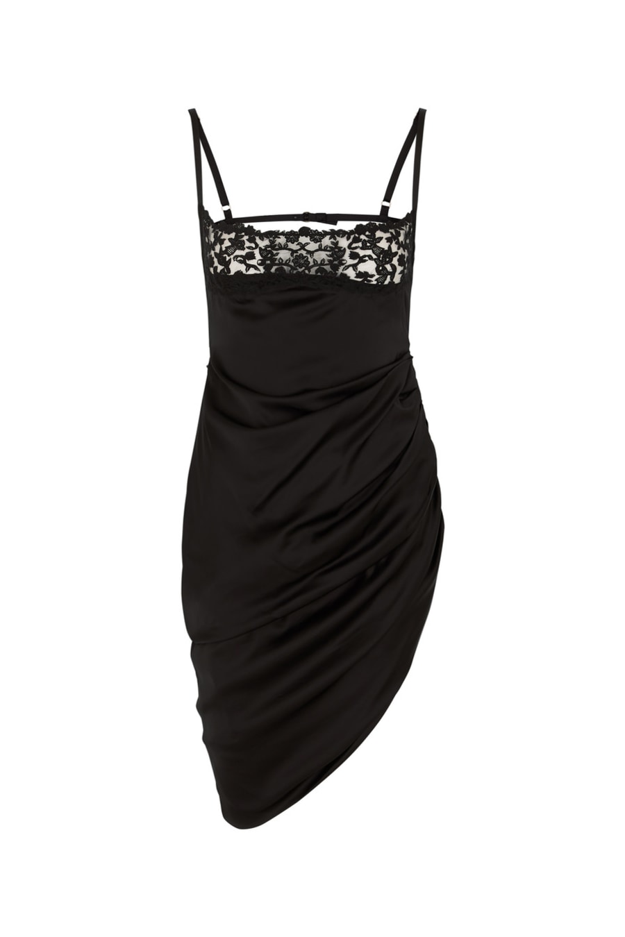 Jacqumeus gives one of its signature styles an alluring after-dark feel for the La Saudade Brodée dress. Sitting close to the frame, this mini design is cut from ruched satin to an asymmetric silhouette and features an open back and a delicate lace-trimmed neckline.