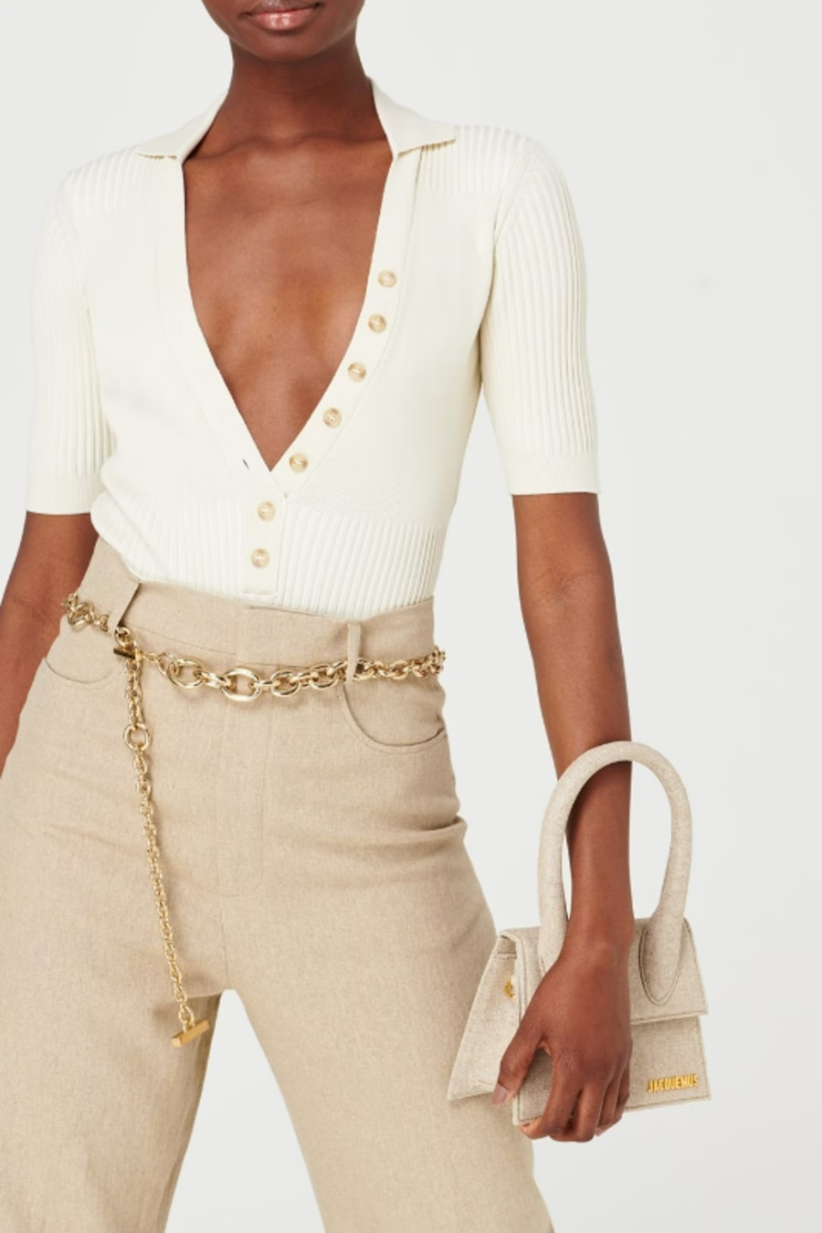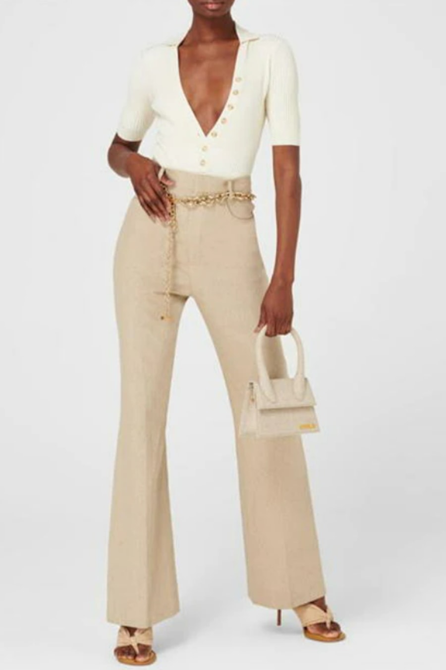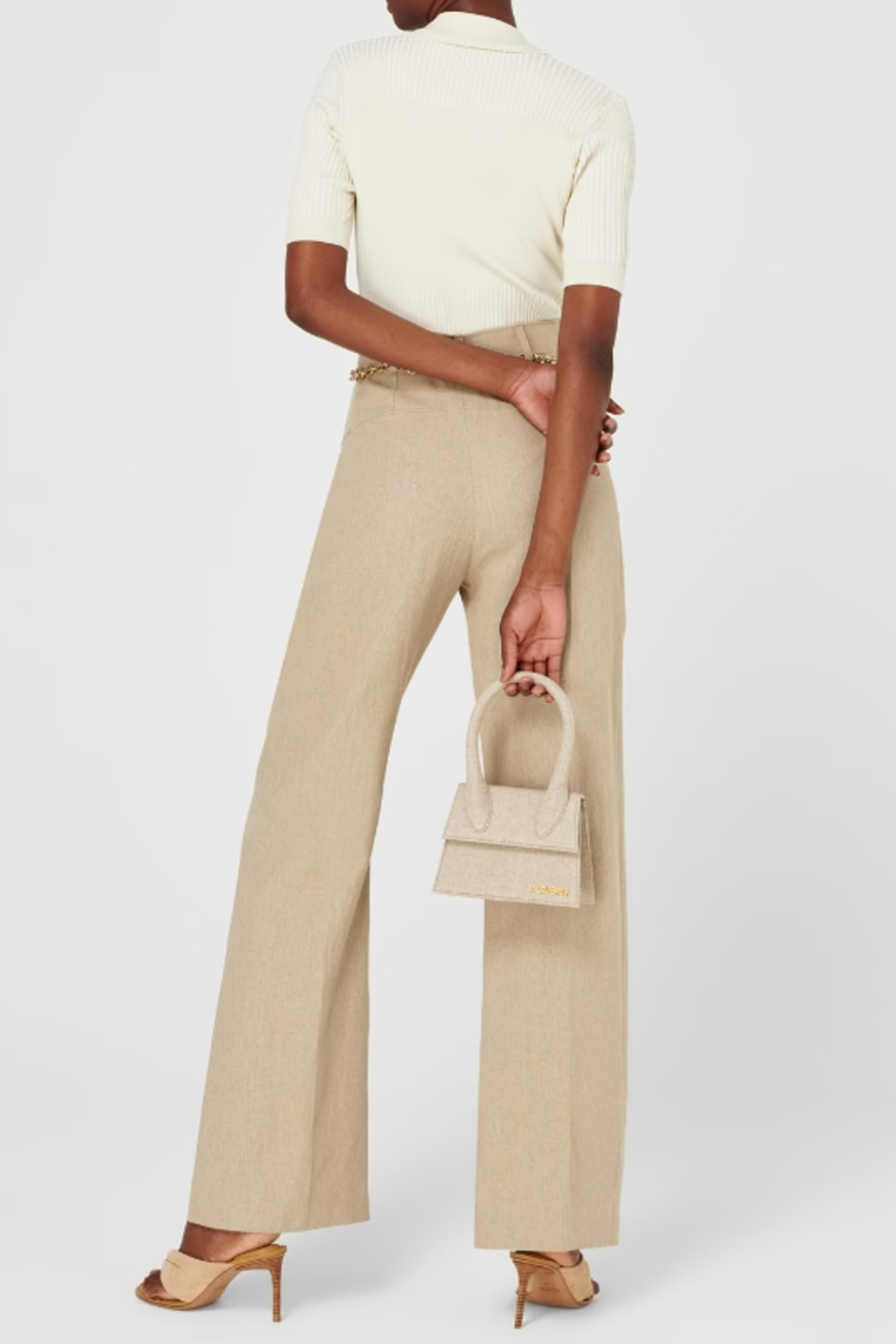 First debuted at the brands L’Amour wheat field fashion show, the Le Pantalon Sauge High Waisted Trousers from jacquemus. Natural ingrediants such as hemp and virgin wool construct these soft blend trousers which feature a ,concealed button, hook and eye with zip fly fastening and tonal stitching throughout. Crafted in a high waisted fit wear with a crop top, sandals and the brands Le Panier Soleil bag for a tres chic look.