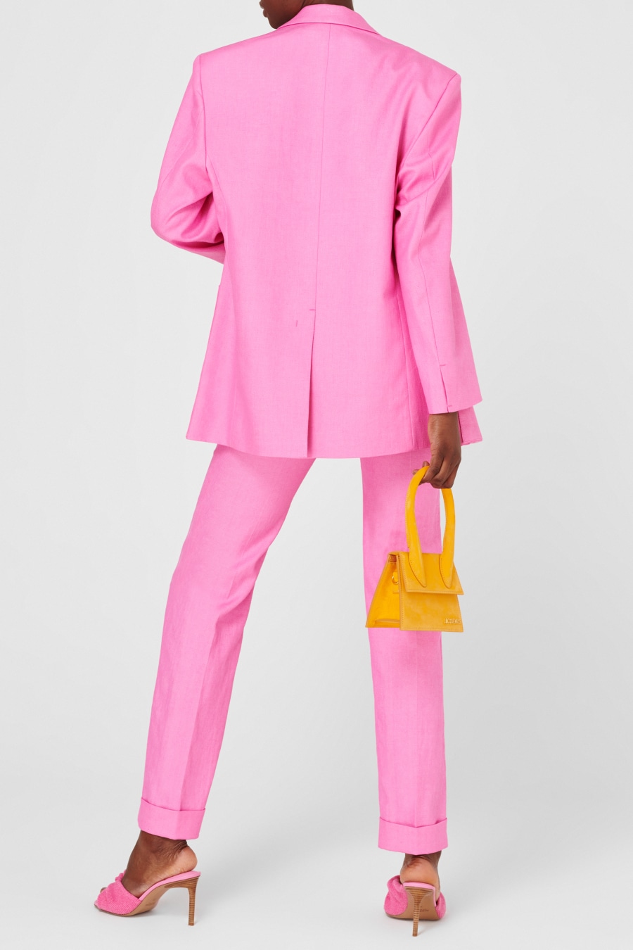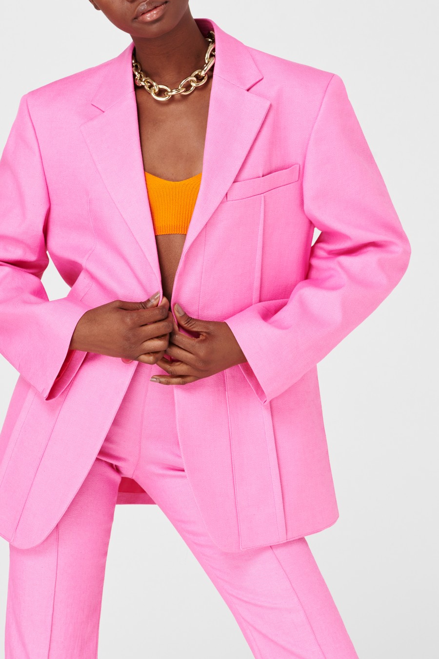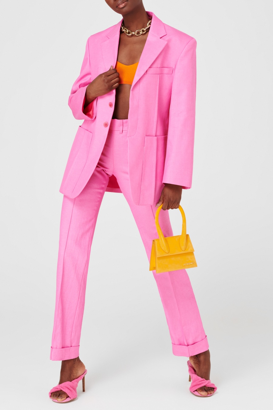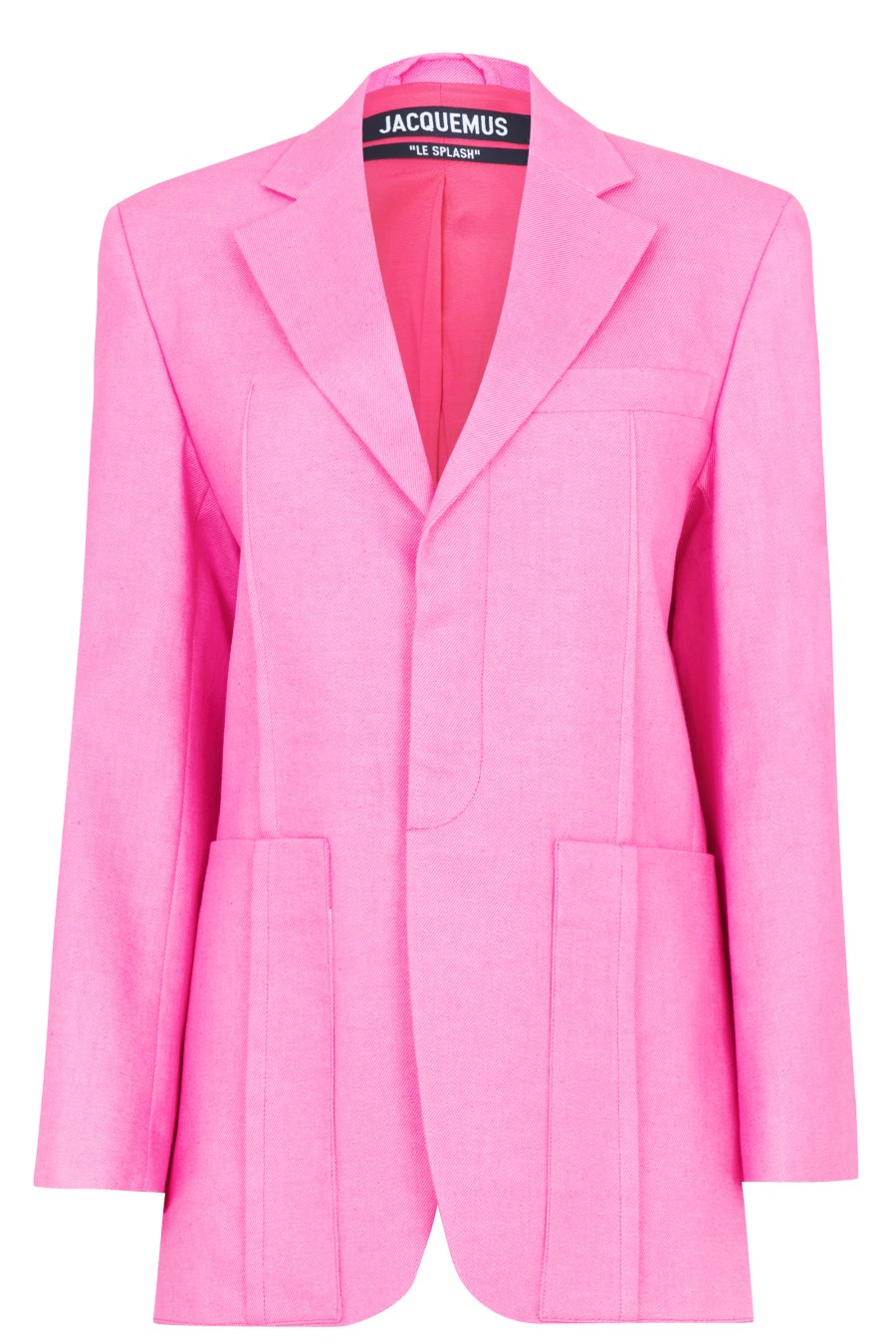Bringing a new definition to femininity with masculine touches from jacquemus the Le Veste D'Homme Oversized Suit Jacket. Crafted from soft pure virgin wool with a notched lapel collar, visible front darts, hidden button placket, large front flap pockets and chest piped pocket, for the defining masculine touch with the central rear slit and subtle Jaquemus branding.
