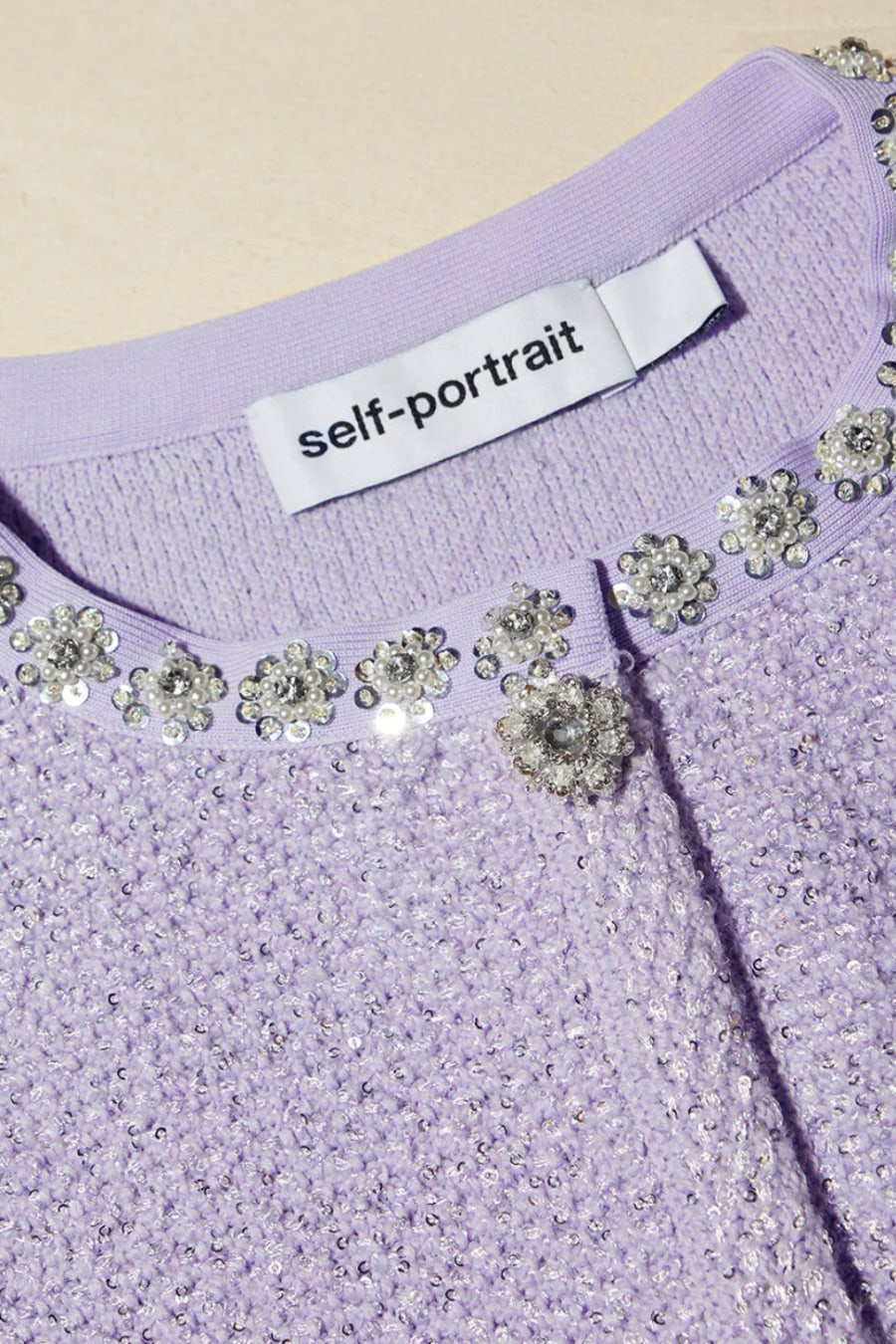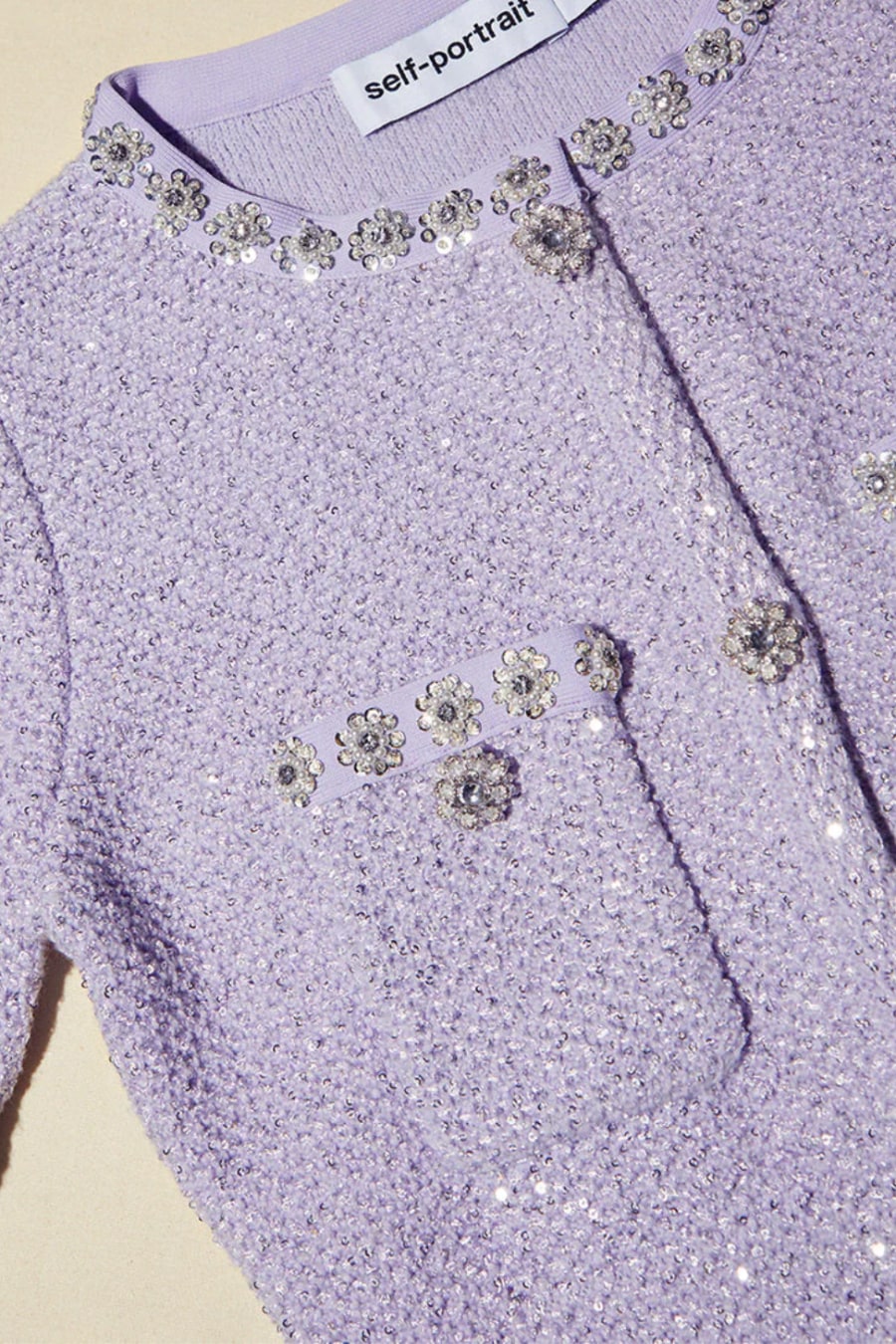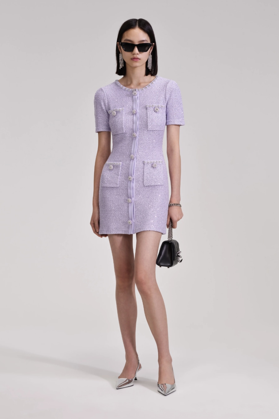 Knitted with purple lurex for a stretchy fit and shimmery finish, this short-sleeved dress makes looking polished an easy job. The collar, front and pockets are lined with diamanté trim, while a form-fitting silhouette and leg-lengthening hem guarantee a steady flow of compliments. Pair it with ballet flats for a smart workday look and dress it up with heels when cocktail hour comes. Check the Size Guide to find your perfect fit.