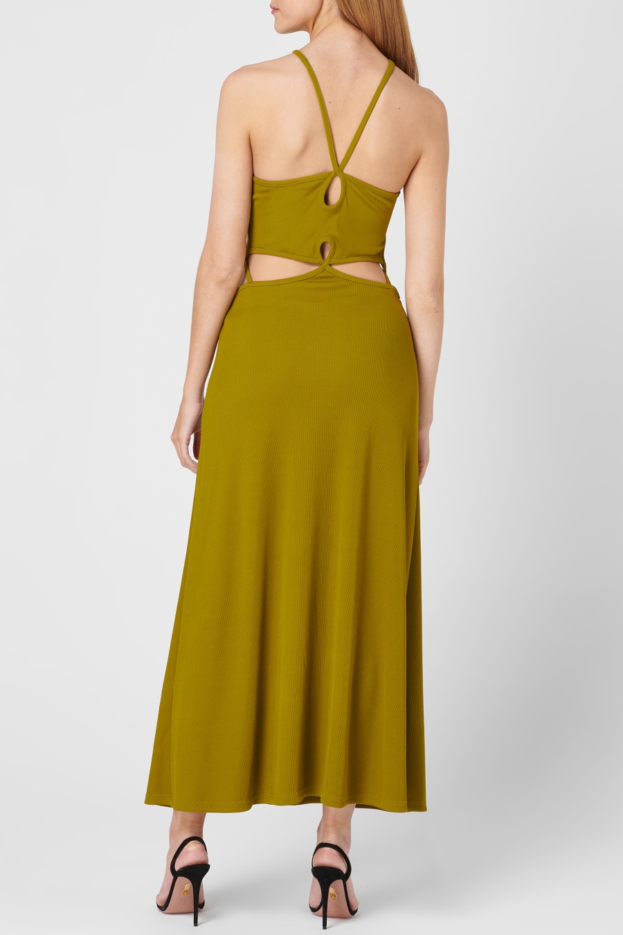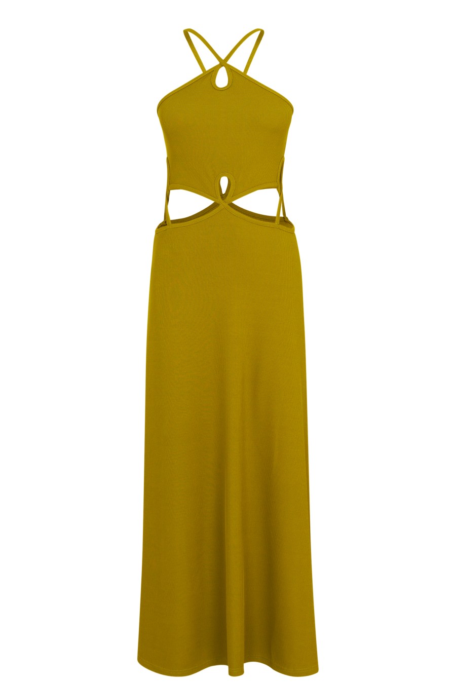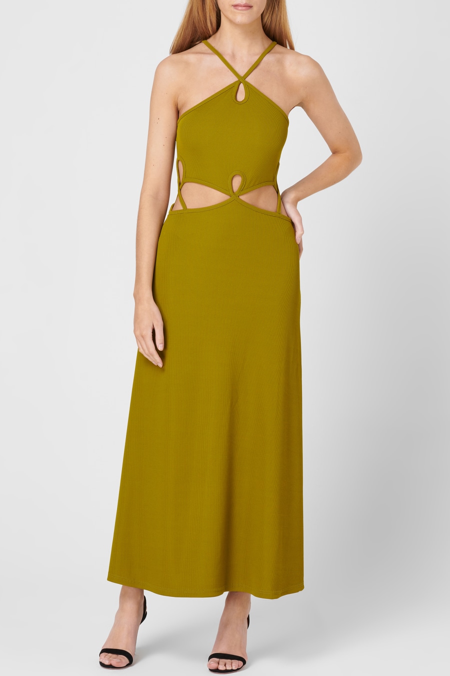Minimalist Oz style with the Loophole Dress from christopher Esber. Made from a polyester mix, this midi length dress is designed in a halter neck style with a keyhole neck and cut outs. With the waist cut outs accentuated by intertwining ties, the look is complete with Christopher Esber branding.