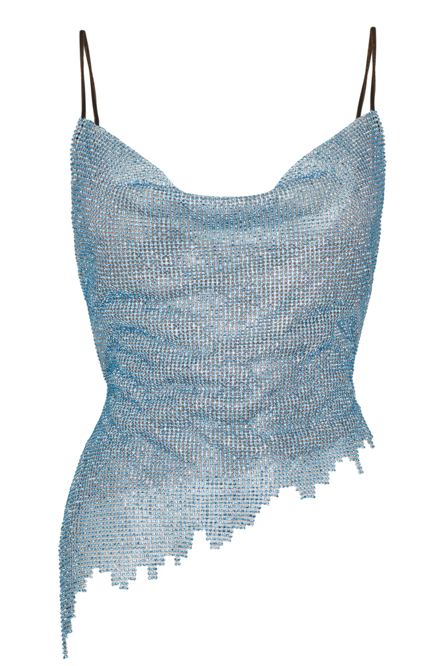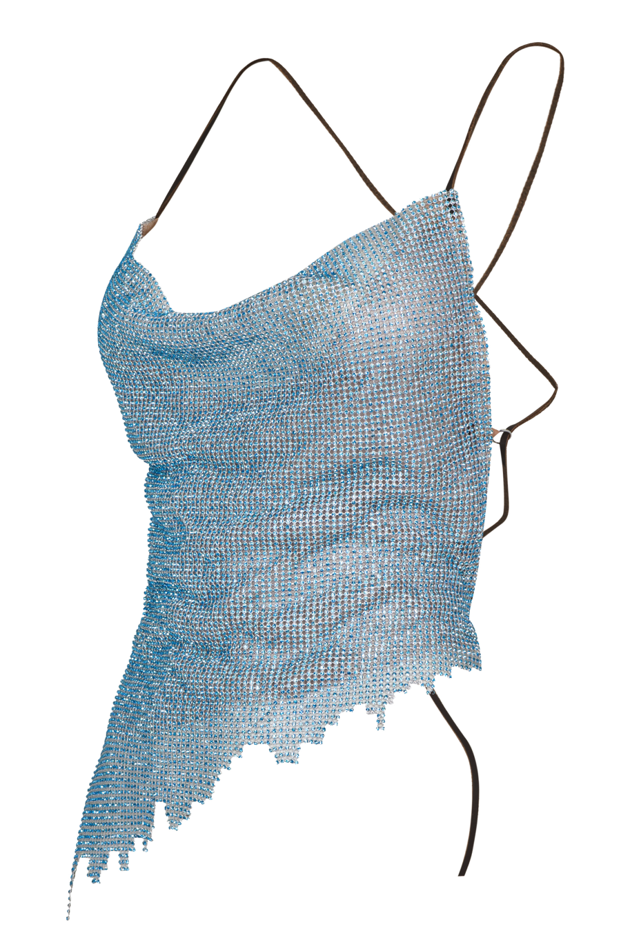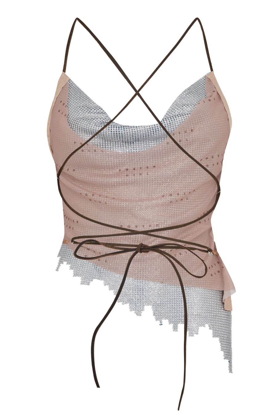 Add a statement piece to your evening attire with the poster Girl Maya Top. Crafted with a crystal-embellished chainmail silhouette, this top has a nude mesh lining underneath for added protection. Complete with a tie-back strap detailing to secure the central bodice, this top is finished with an asymmetrical hemline for a bold feminine touch. Pair with jeans or a mini skirt for a complete look. Please handle with care when styling or trying this garment on with other items. Outer: 100% Aluminum. Lining: 95% Polyamide and 5% Elastane.