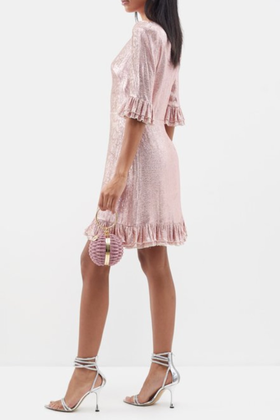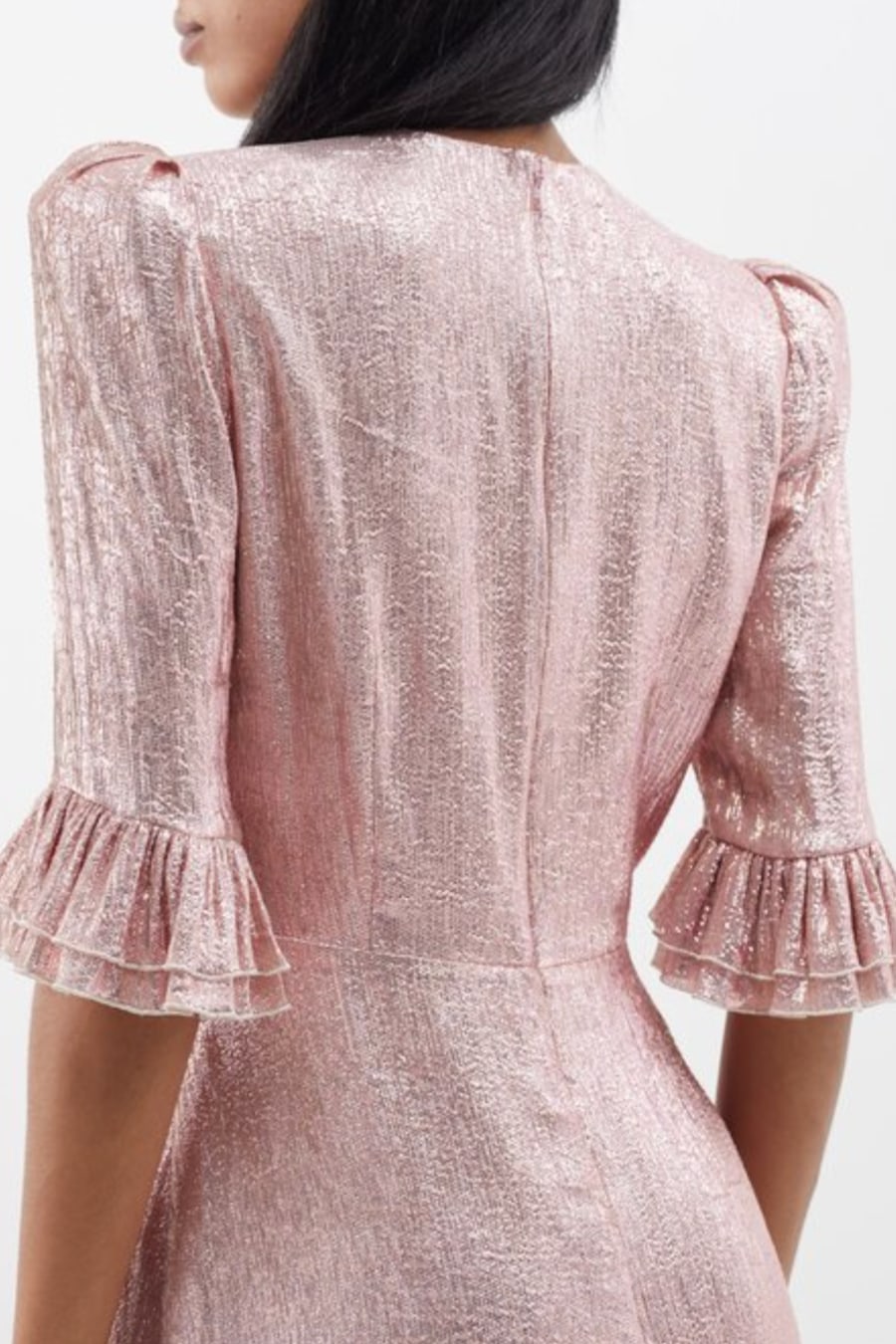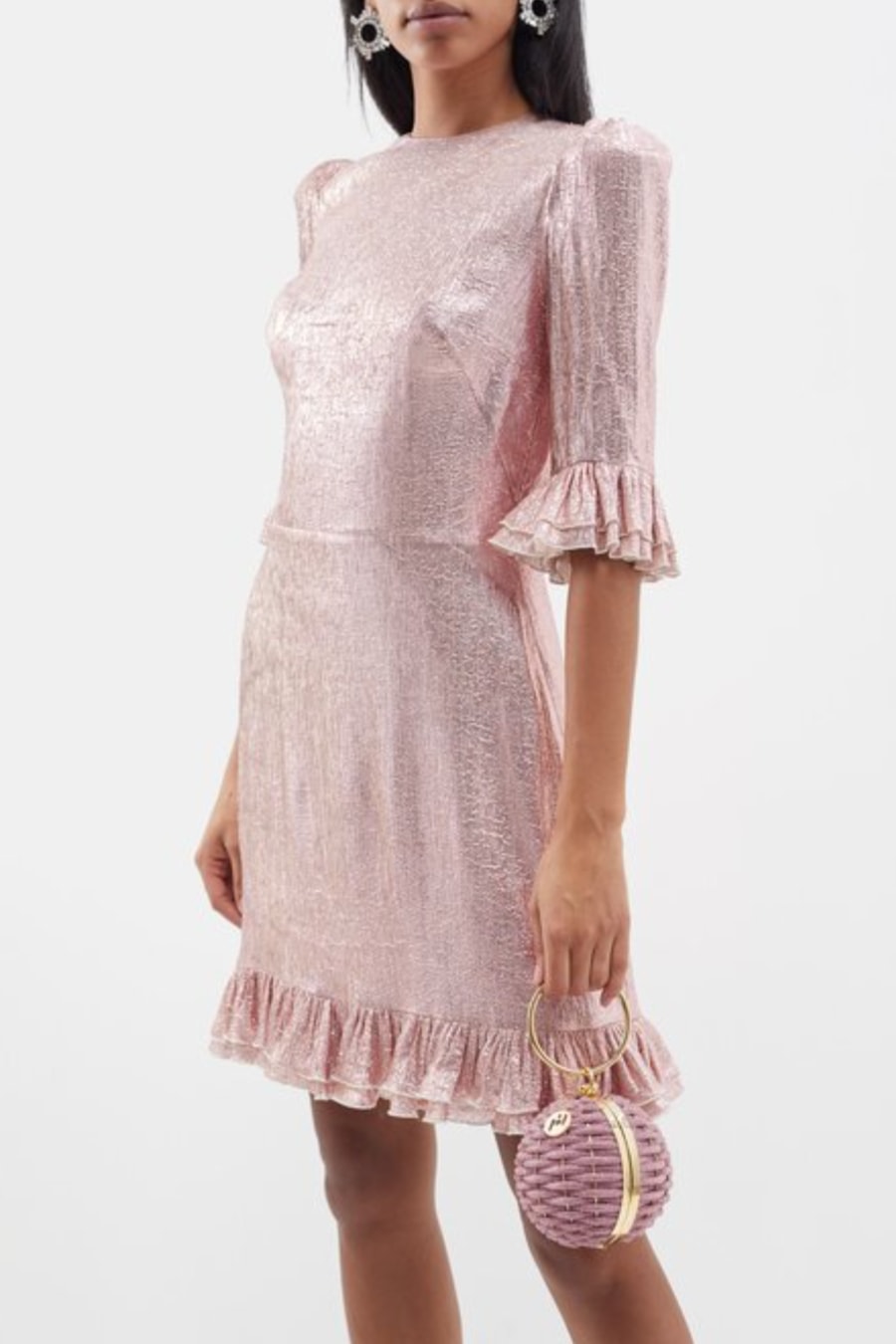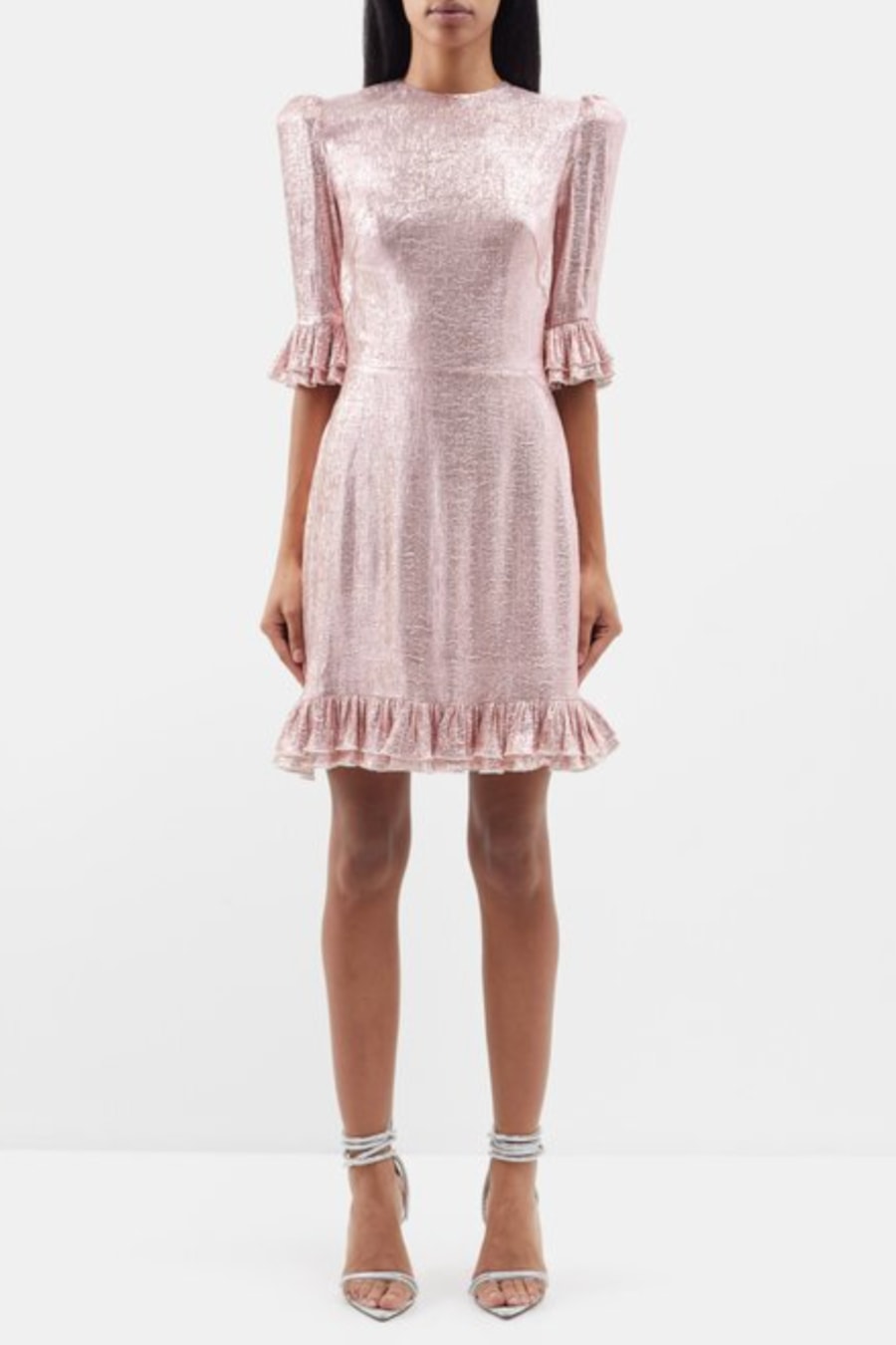 The Vampire's Wife's shimmering pink wool-blend lamé mini dress draws inspiration from gothic influences seen through the layered, ruffled trims on the sleeves and hem.