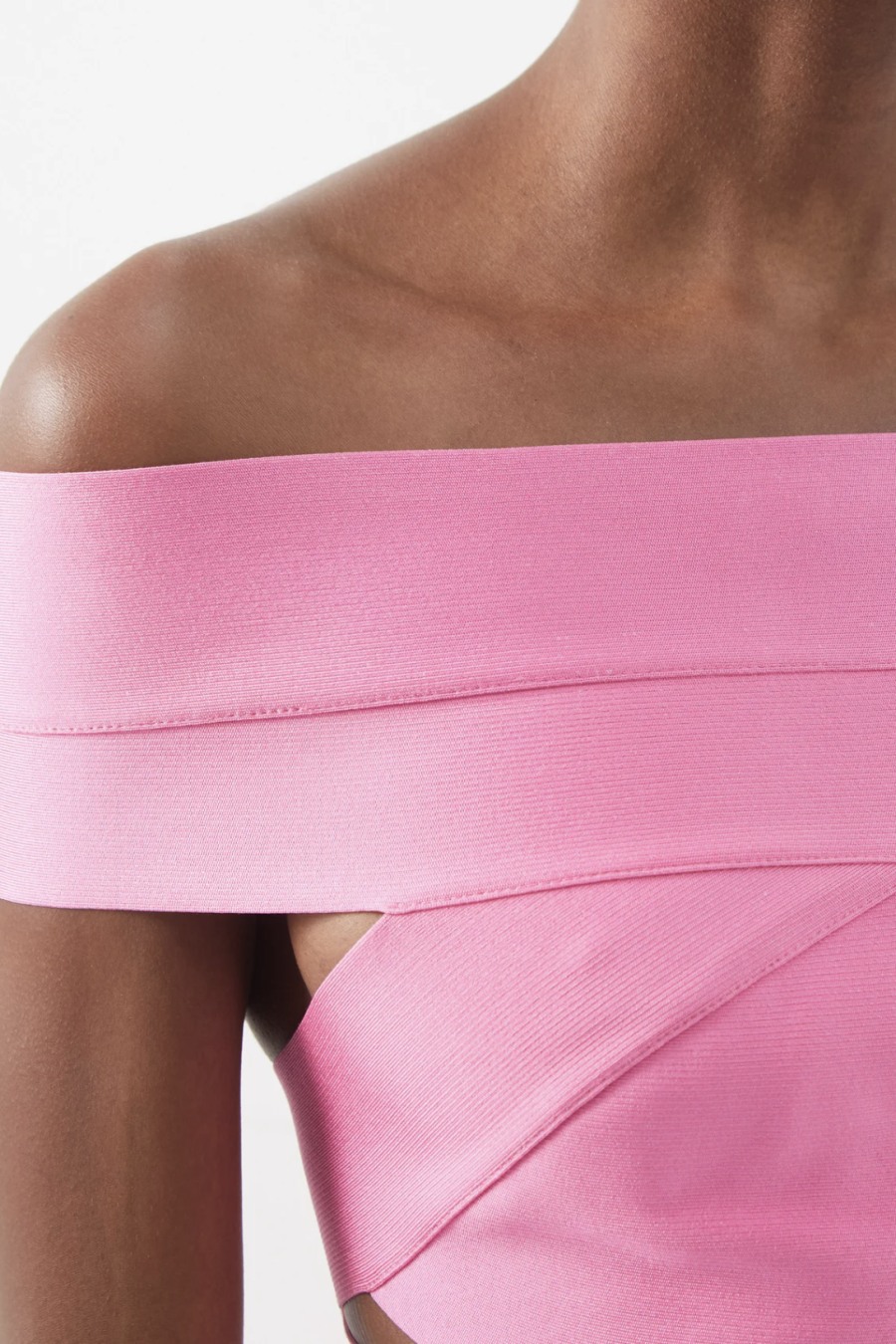 Alexandre Vauthier's pink mini dress is knitted to a 1980s-inspired off-the-shoulder silhouette with daring cutouts on the waist and thighs, channelling the designer's high-octane aesthetic.