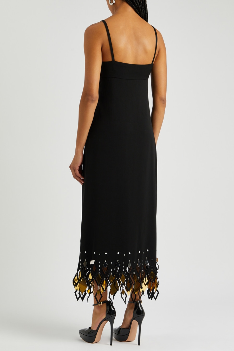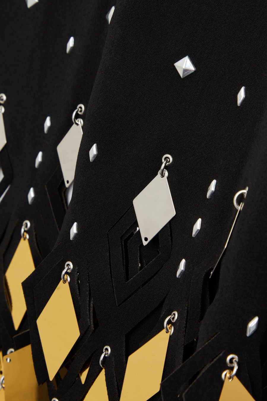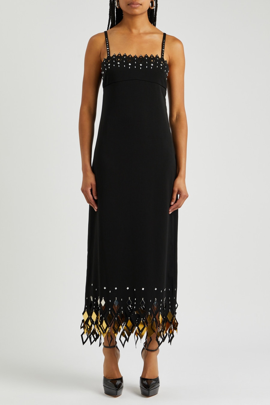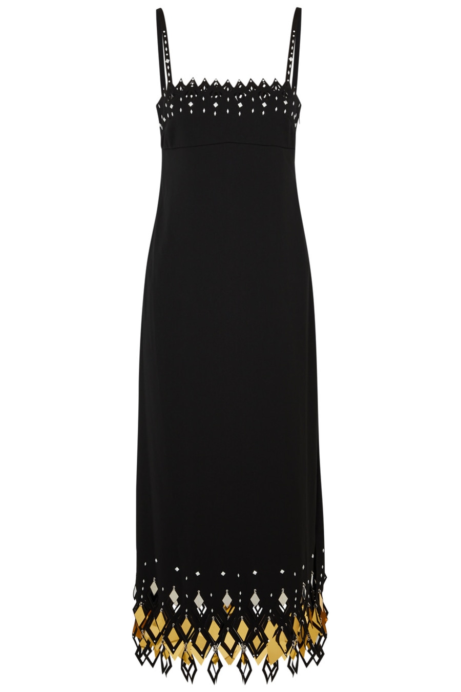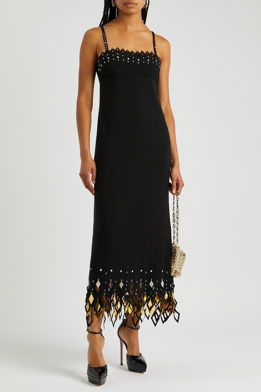 Rabanne balances a clean silhouette with maximalist embellishment for this dress. Traced with zigzag trims and studded details at the neckline, this crepe style falls through a calf-length profile that’s anchored with swishing diamond-shaped paillettes and matching cut-outs.