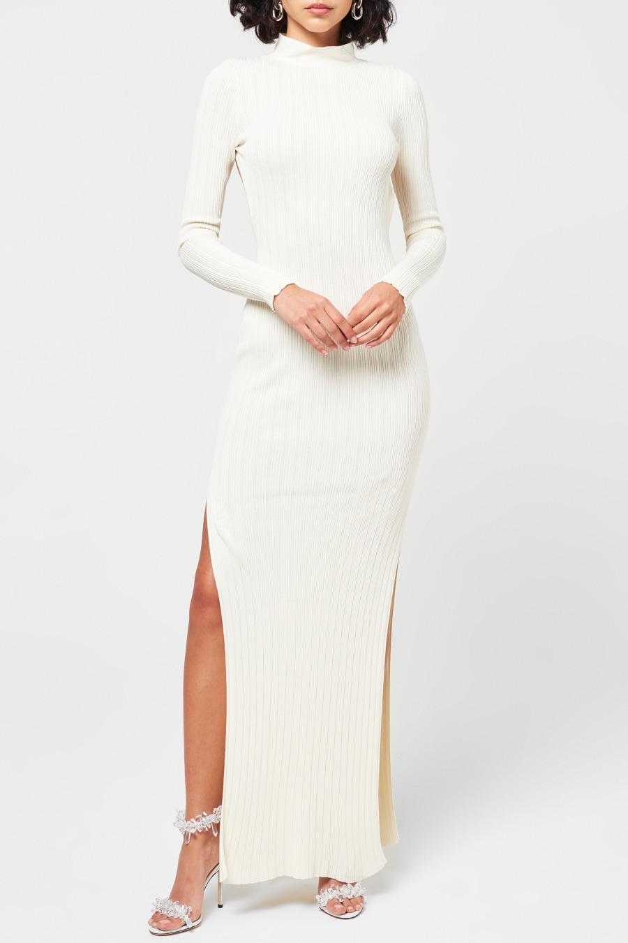 Add to your collection with the Reposier Dress from aya Muse. Designed with a high stand collar alongside long sleeves, this dress is cut to a maxi length with a thigh high slit to the skirt to add a sultry touch. Characterised by a ribbed construction, this dress is finished with a cut out to the back with a buttoned closure to the back of the neck.