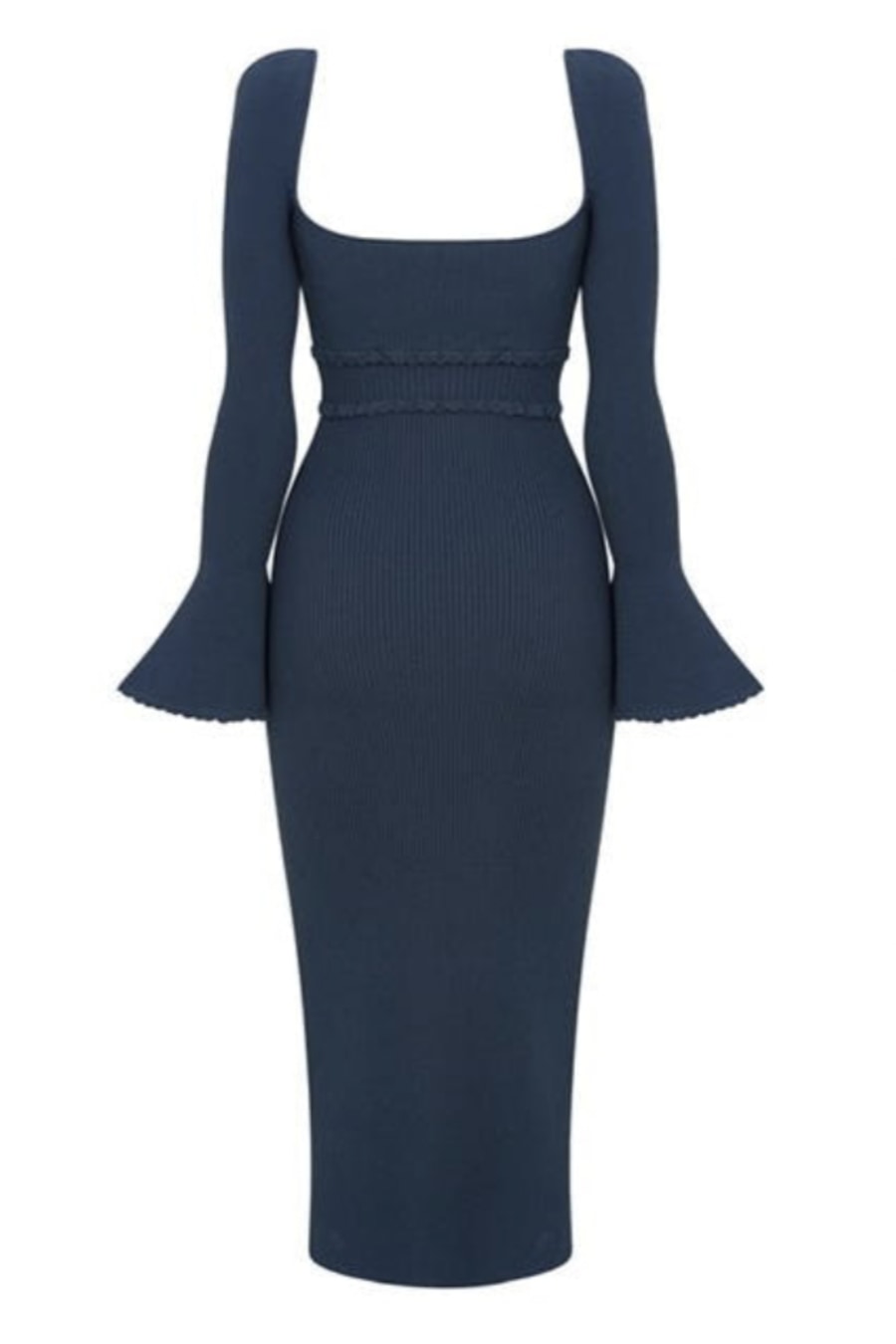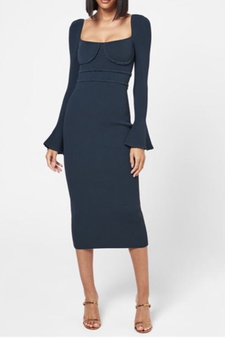 Add a contemporary knit to your collection with the Scallop Edge Midi Dress from self Portrait. Designed with a flattering sweetheart neckline framed by long flared sleeves, this dress offers a slim fit and midi length for a chic silhouette. In a ribbed knit construction, this dress is finished with a scalloped trim surrounding the sleeves and bust.