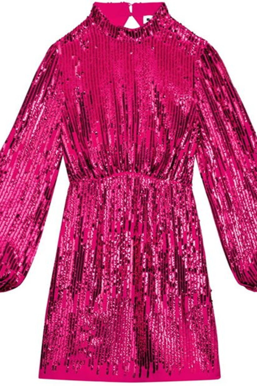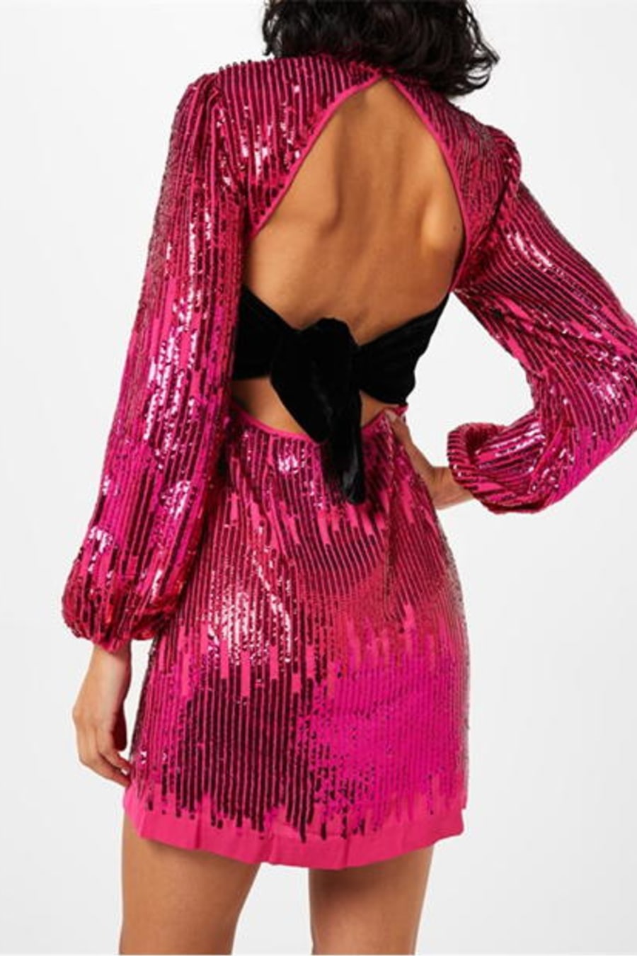 RIXO's Sequinned Lara Mini Dress is the perfect retro inspired addition to your formalwear. Crafted in a polyester composition, this classic silhouette features a stand collar, long puffed sleeves with elasticated cuffs, a velvet tie fastening to the back and a straight hem. Adorned in all over tonal sequins for a dramatic finish, this is the natural choice to make a statement, whatever the occasion. Main Fabric / Lining: 100% polyester. Contrast: 70% viscose, 30% silk. Dry Clean Only - always refer to and follow washing instructions for best wear.