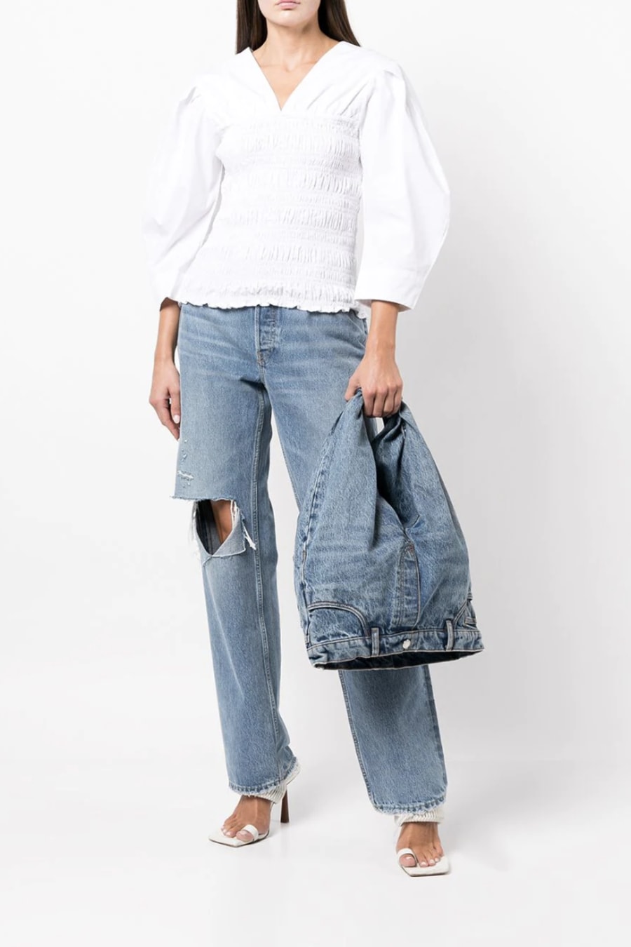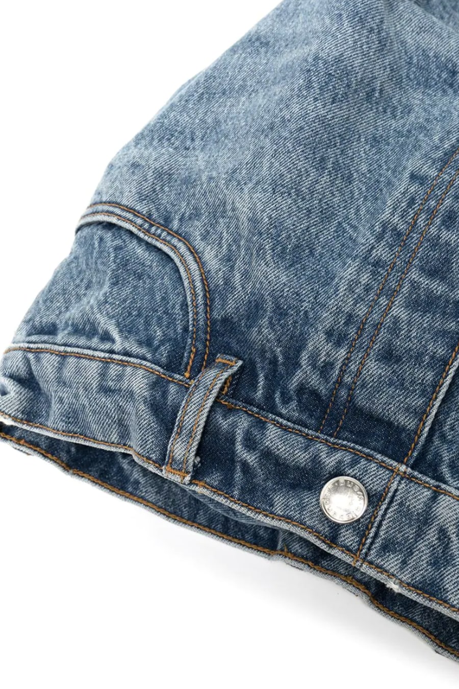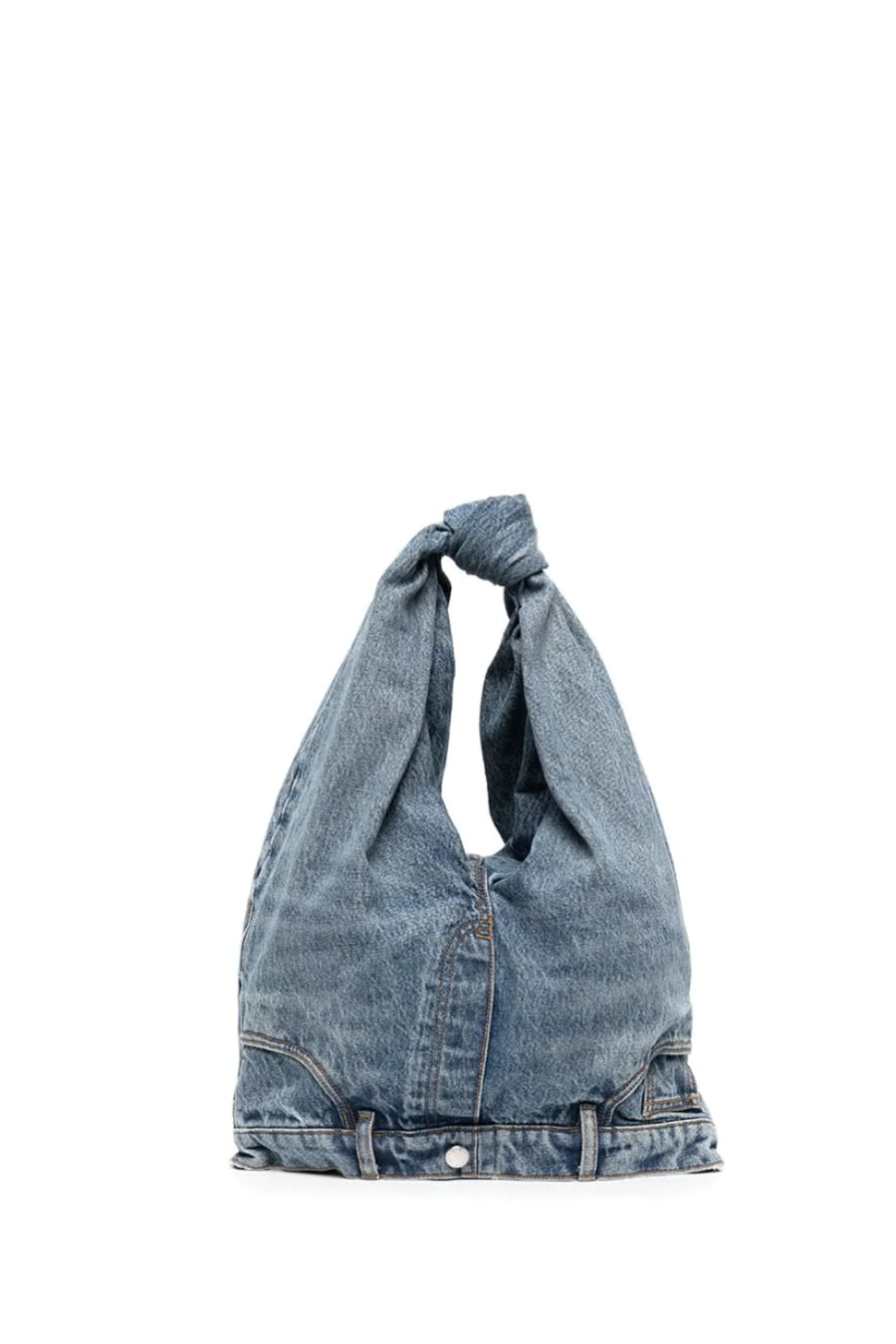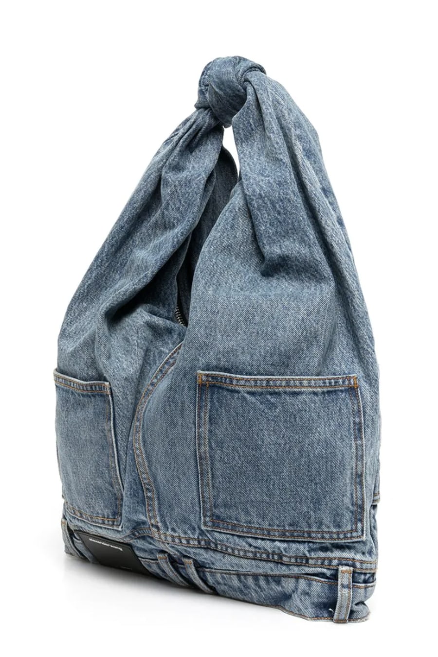 small five-pocket denim tote bag from ALEXANDER WANG featuring indigo blue, denim, multiple patch pockets, knot detailing, top zip fastening, main compartment, single top handle and cotton.