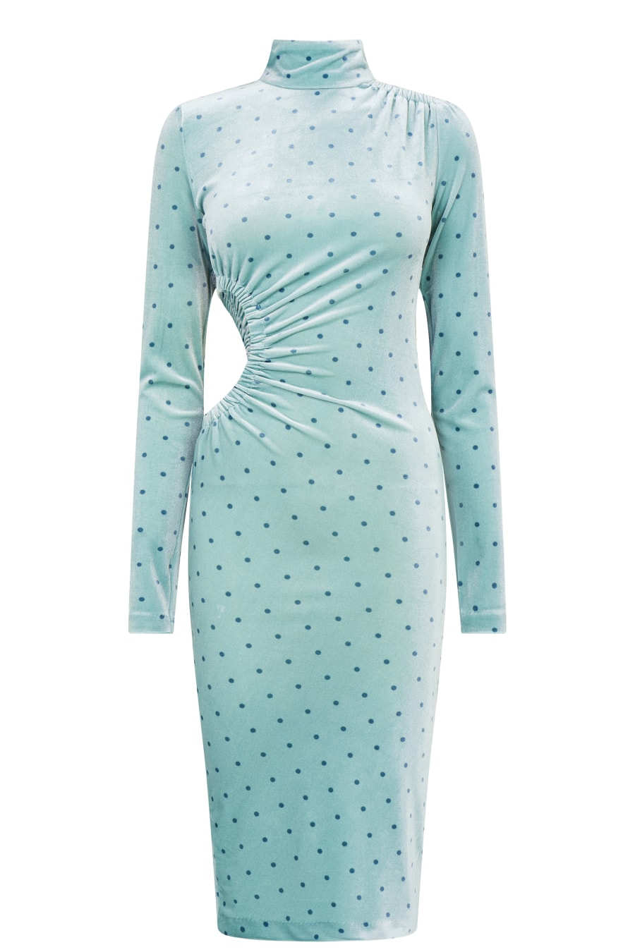 Update your wardrobe with the Alice Midi Dress by rotate. Designed with a mock neckline and long sleeves, the dress comes styling a cut out detailing at the waist and an all-over polka dot pattern. With the velvet construction offering a high quality look and feel, the dress will be perfect for special occasions.