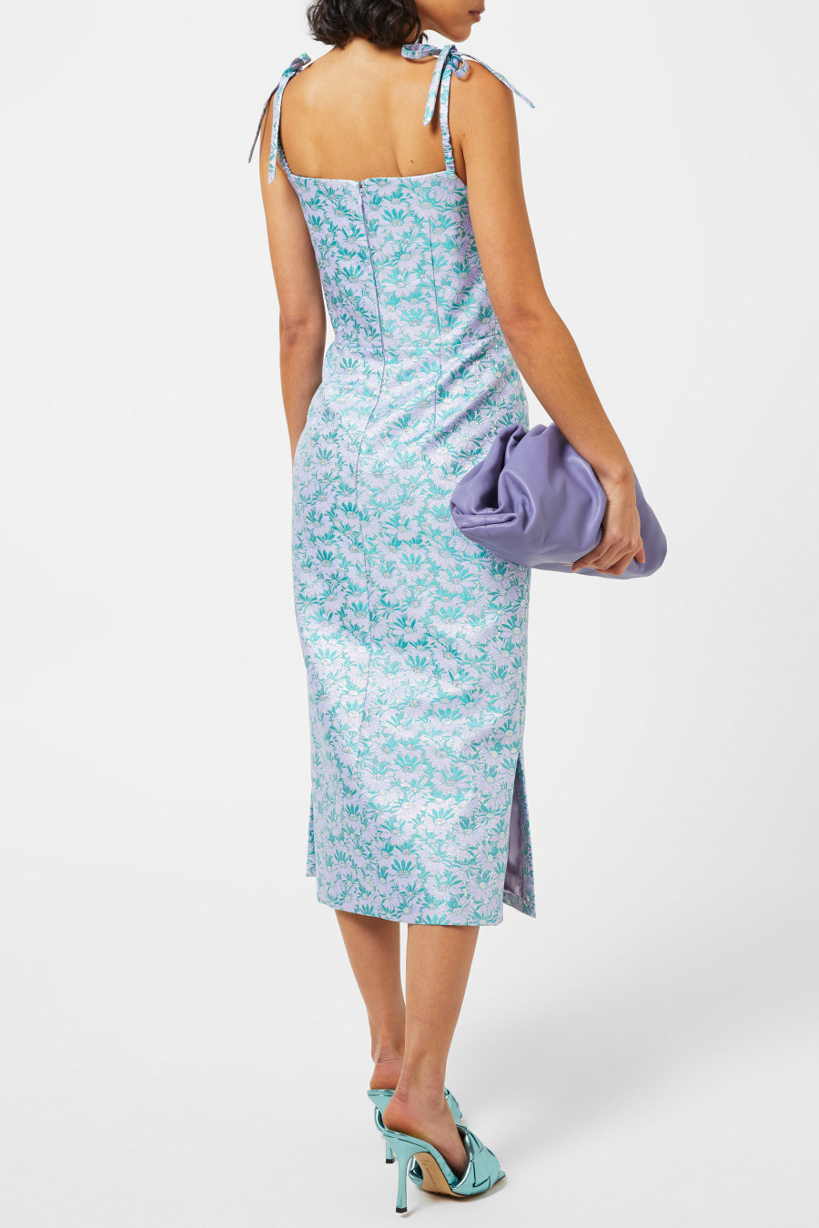 Elevate your wardrobe with The Night Garden Dress from the Vampire's Wife. Crafted in a metallised polyester fabrication, this midi dress features a square neckline with tie-fastened strap, a rear zipped fastening, a boned interior bodice, vents at the seam and a straight hem for a classic style. The design is completed with an all over metallised floral print.